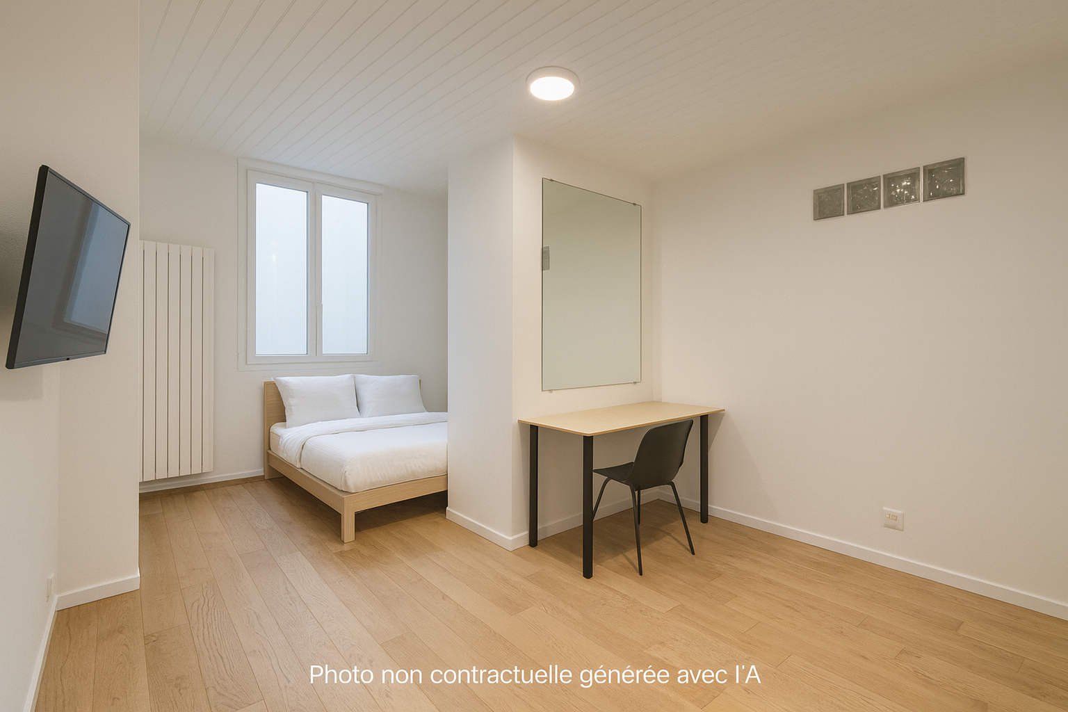 Au deuxième étage d'un immeuble ancien, il se compose d'une cuisine entièrement équipée (plaques, réfrigérateur/congélateur, micro-ondes, cafetière), d'une salle d'eau avec douche, vasque et WC suspendu, et d'une grande pièce de vie chaleureuse avec coin nuit séparé, espace salon, bureau, grand dressing et télévision
