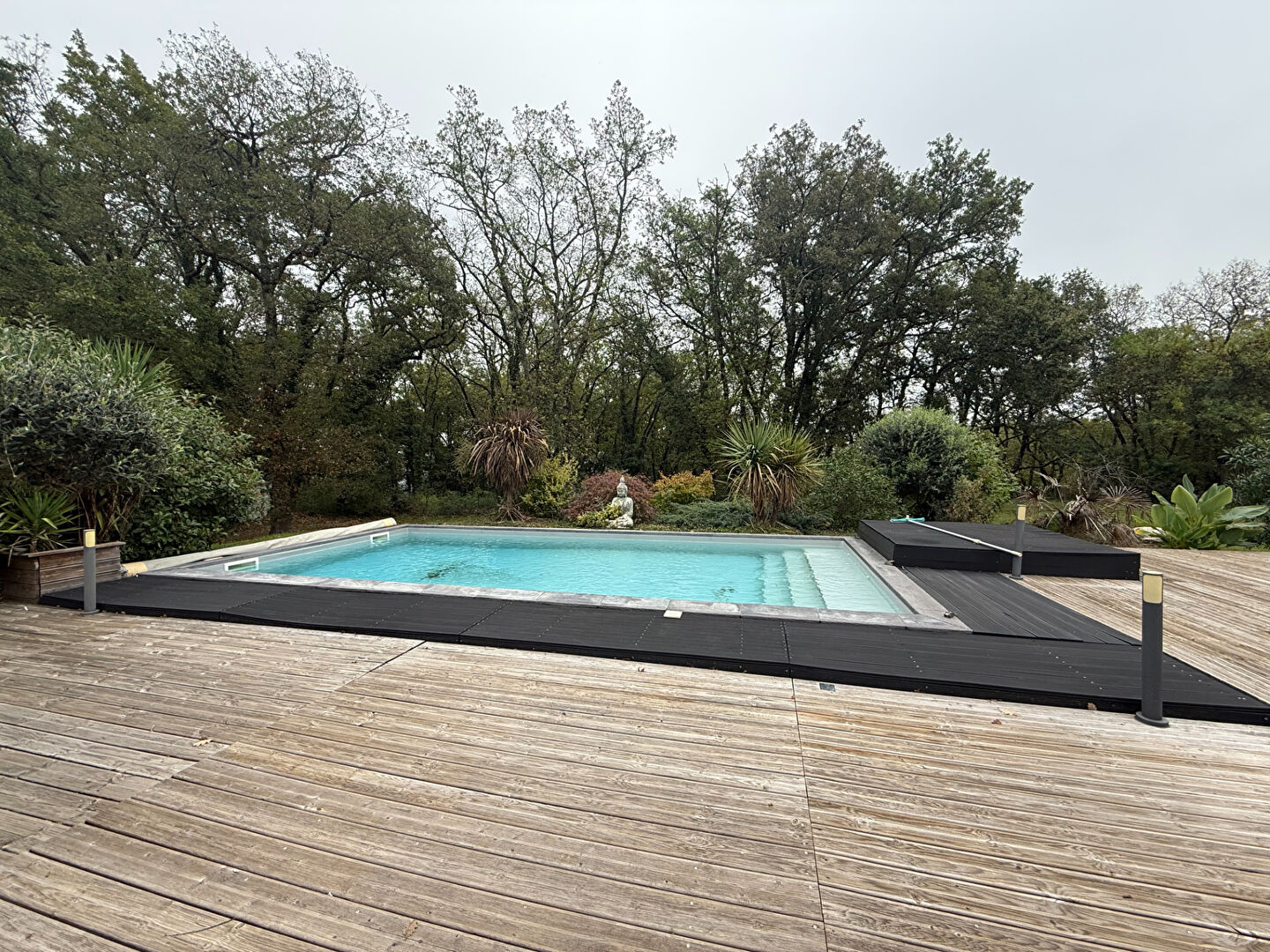 À l'extérieur : Profitez d'une terrasse plein sud avec vue sur le bois et la piscine (8x4m avec bâche, liner et au sel) sans vis-à-vis, jardin entièrement clôturé, cabanon, micro station neuve et vidangée (août 2025), portail électrique.
