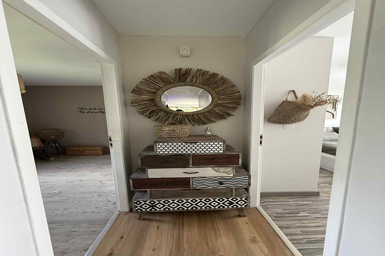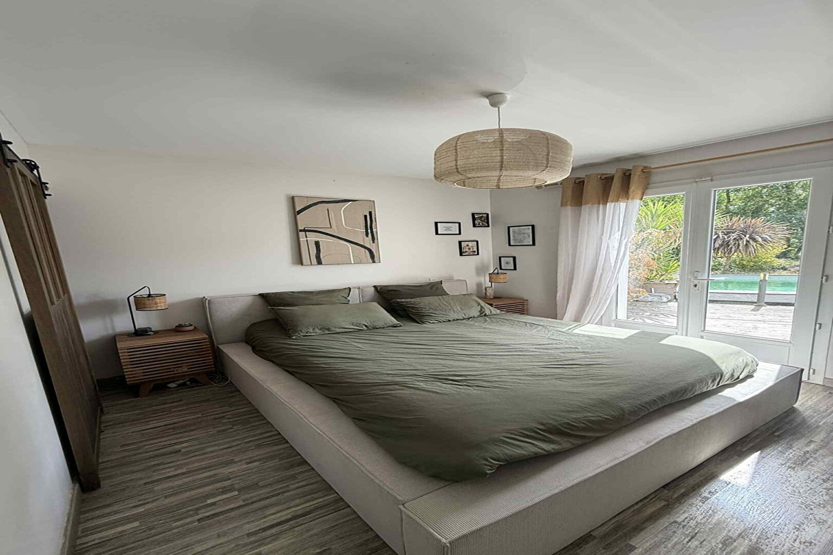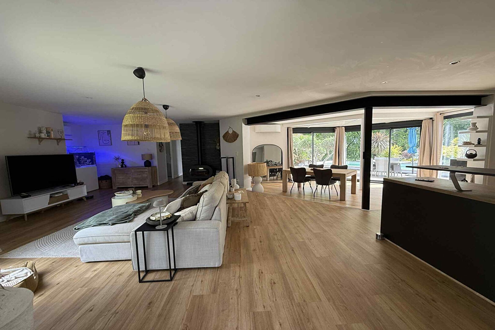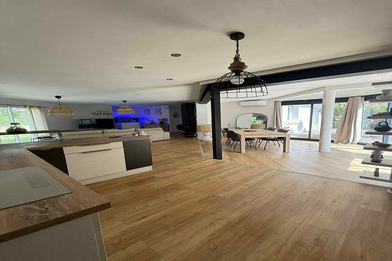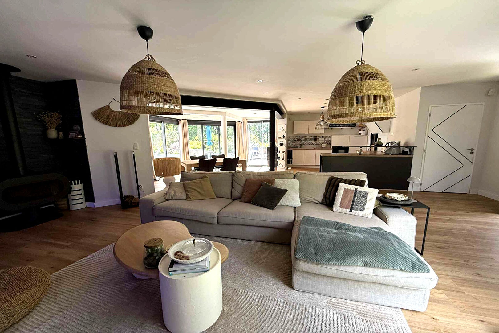 La maison se compose d'une entrée s'ouvrant sur une grande pièce de vie conviviale et lumineuse (climatisation réversible et poêle à bois) avec sa cuisine ouverte moderne et fonctionnelle donnant accès à la terrasse ainsi qu'à la piscine.