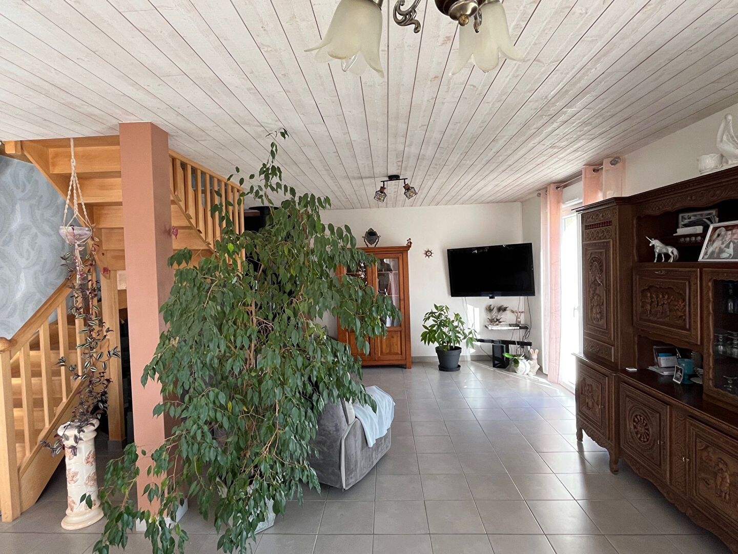 A l'étage : un palier desservant une grande mezzanine d'environ 19 m² (pouvant être transformée en une 4ième chambre ) 2 belles chambres et une salle de bains avec WC.