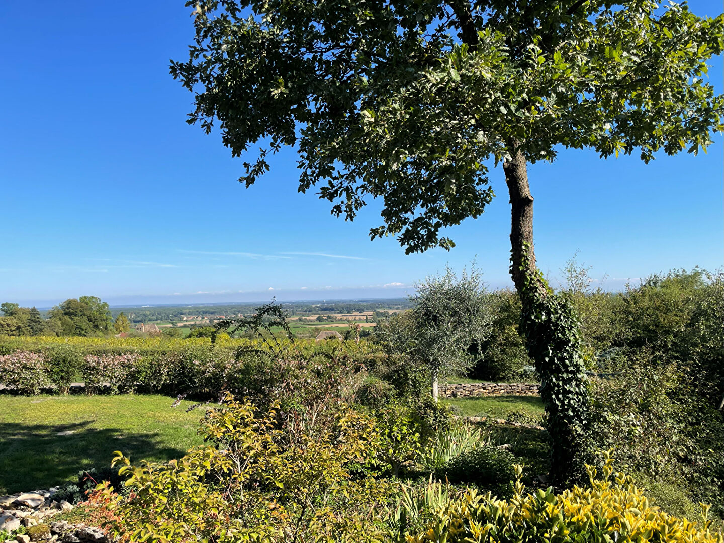 Implantée à flanc de colline bénéficiant d'une vue imprenable, dans un cadre d'exception et bucolique, MAISON DE CONSTRUCTION RECENTE (année 2004 - ossature bois) de plain pied comprenant : hall-dégagement desservant : une grande pièce à vivre séjour avec espace cuisine aménagée (ouvrant sur terrasse et jardin - poêle faïencé), une chambre, salle de bains, WC, bureau-vestiaire , lingerie, garage double à la suite avec une cave enterrée) ; à l'étage : trois espaces nuits et salon détente, grenier aménageable à la suite.