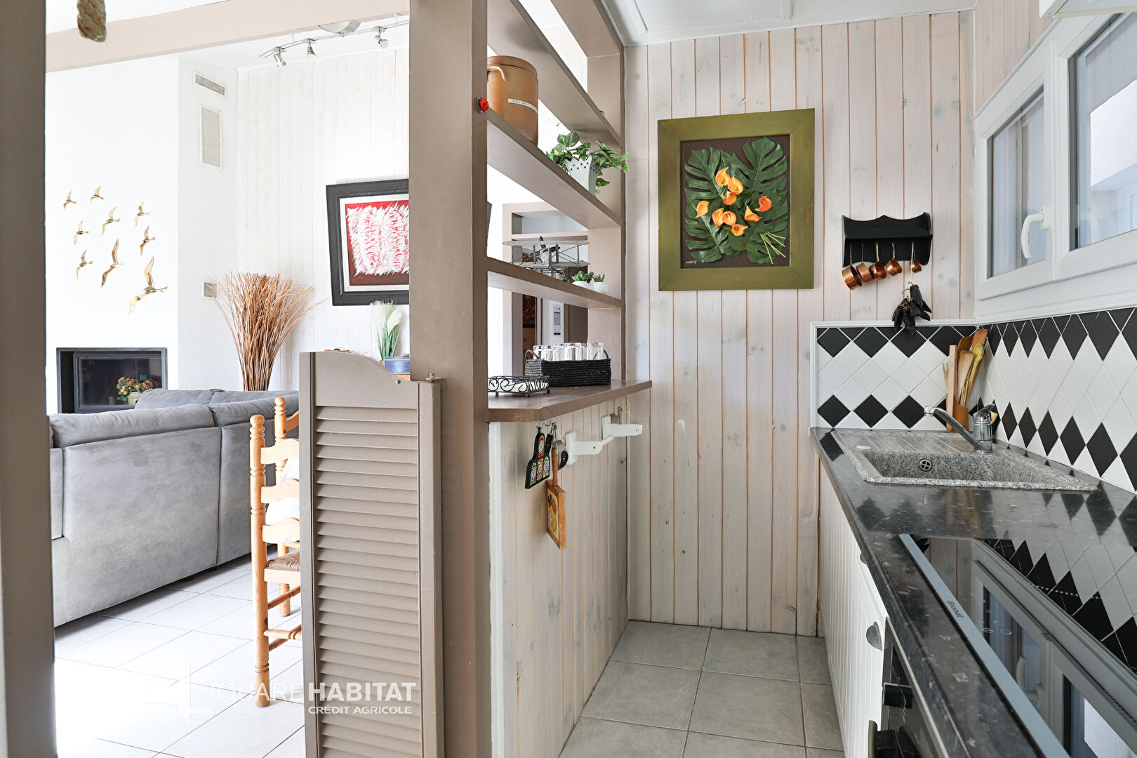 Une cheminée insert agrémente l'espace de vie de 24,5m² comprenant le séjour et la cuisine semi-ouverte.