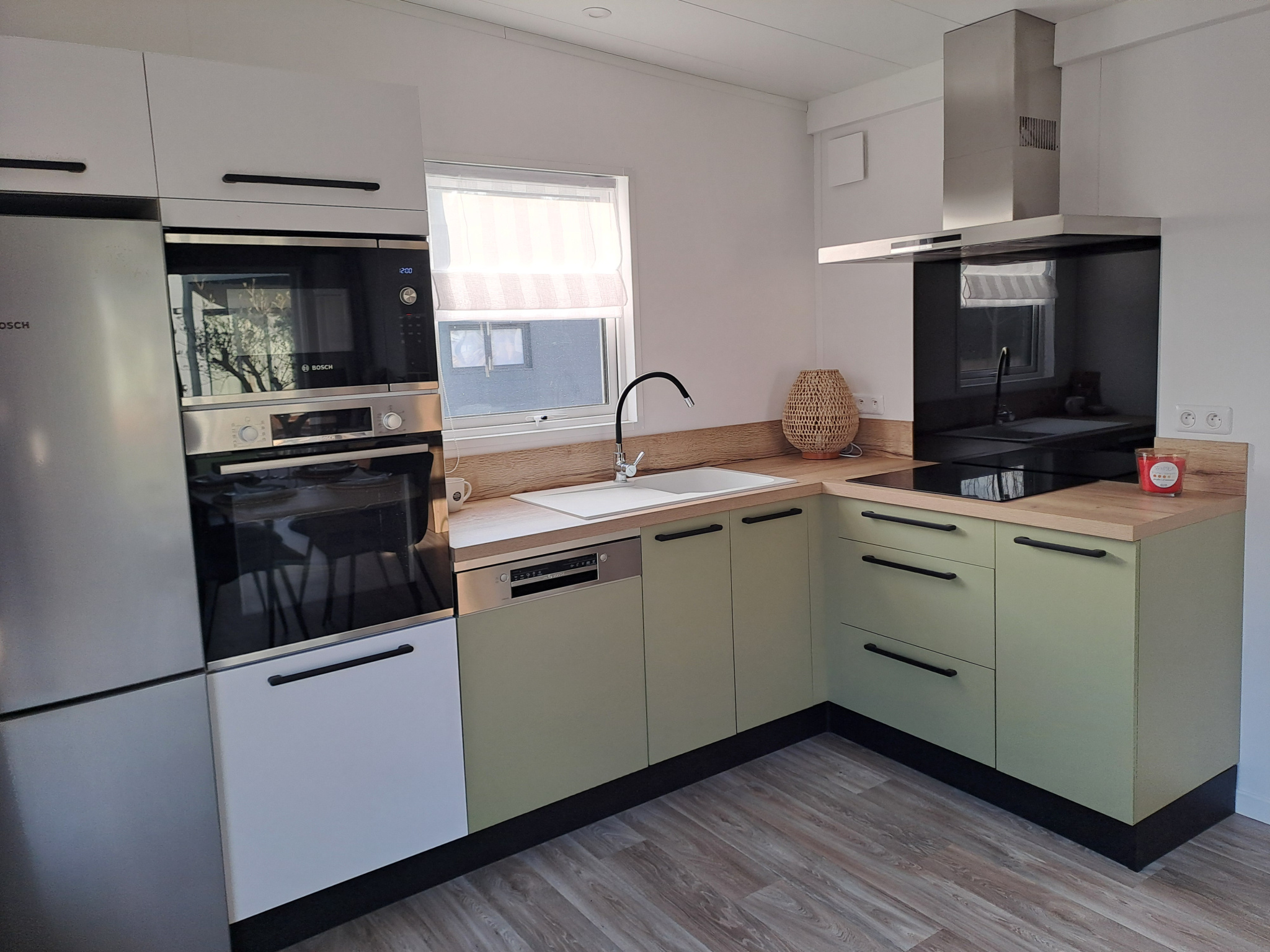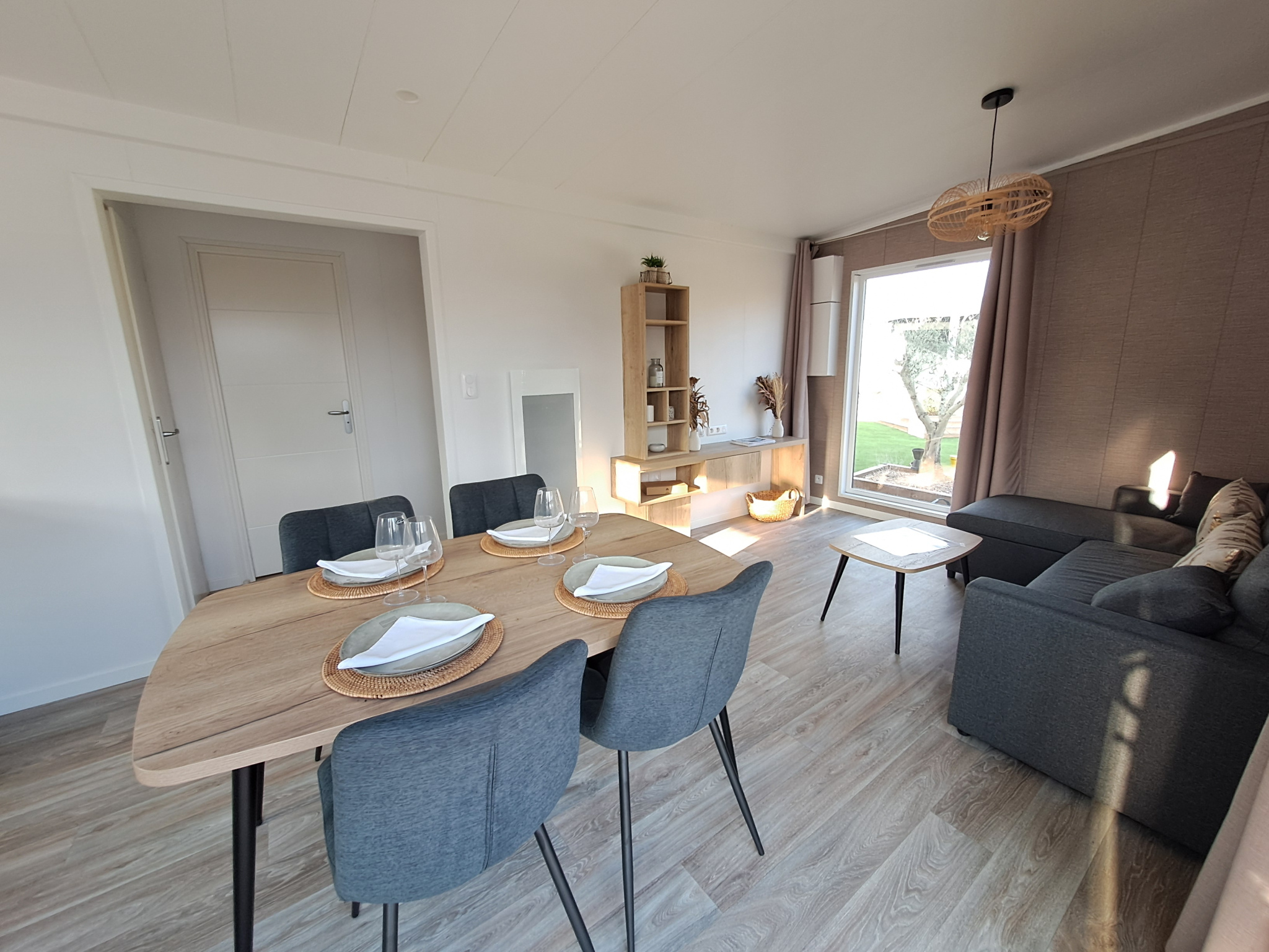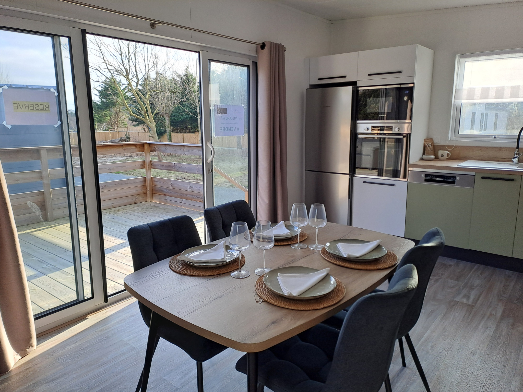 Une pièce de vie avec une cuisine ouverte meublée (meubles hauts et bas) et équipée (réfrigérateur/congélateur, four, micro-ondes, hotte, plaque à induction, lave-vaisselle)