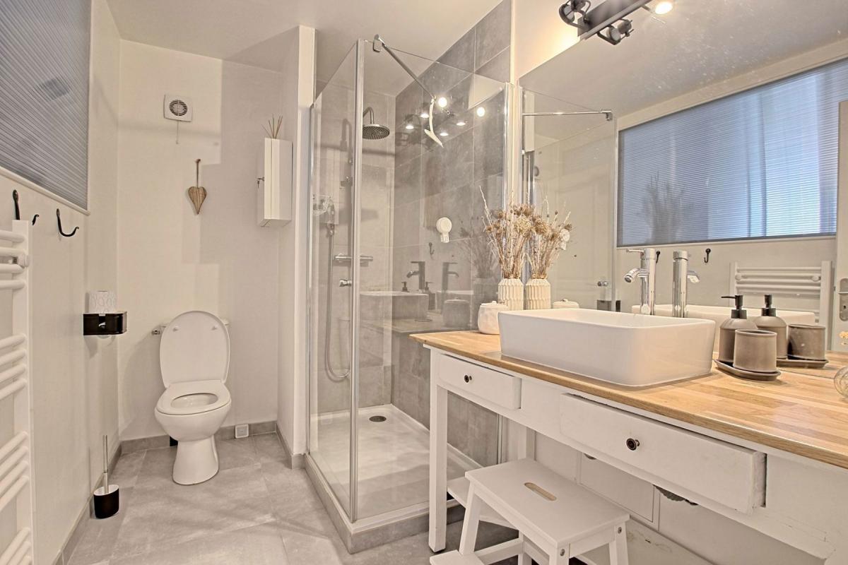 Dès le rez-de-chaussée, une chambre avec rangements avec sa salle d'eau avec douche à l'italienne et WC ainsi que des placards supplémentaires composent un espace pouvant aisément être transformé en studio indépendant pour de la location.