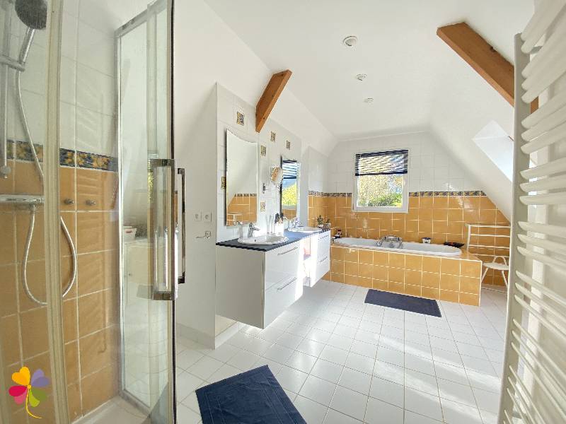 Au premier étage, un palier, trois chambres dont une avec dressing attenant, une salle de bains double, et un toilette.