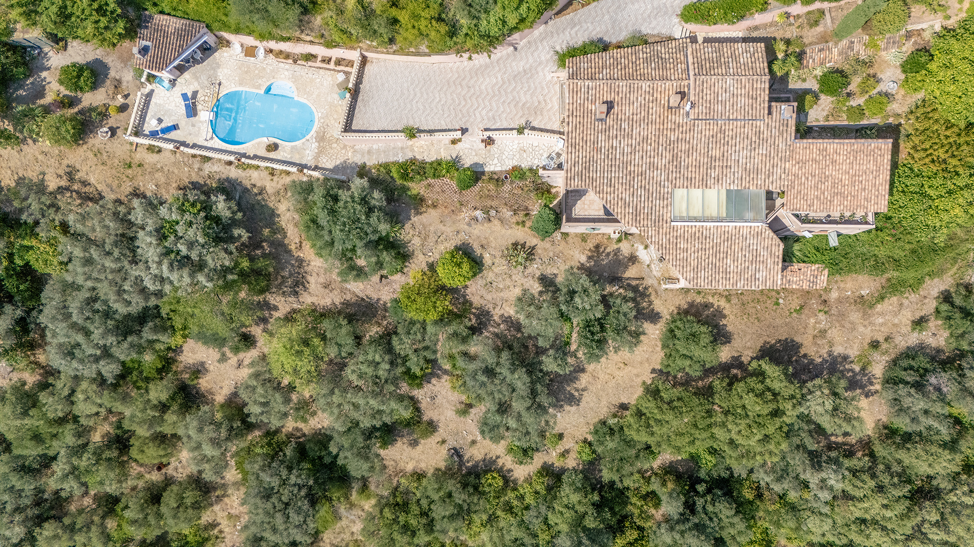 - A l'extérieur : Une piscine traditionnelle de forme libre avec terrasse/plage et poolhouse, une aire de stationnement permettant de garer 4 voitures dans la propriété et un garage d'environ 30 m2 avec accès direct à la villa complète le bien.