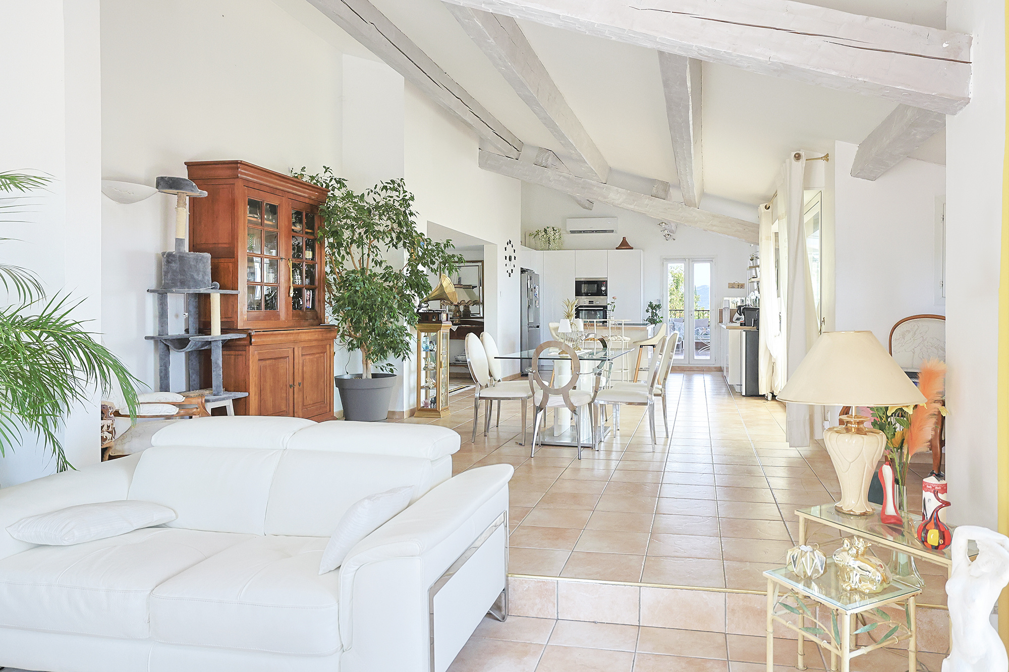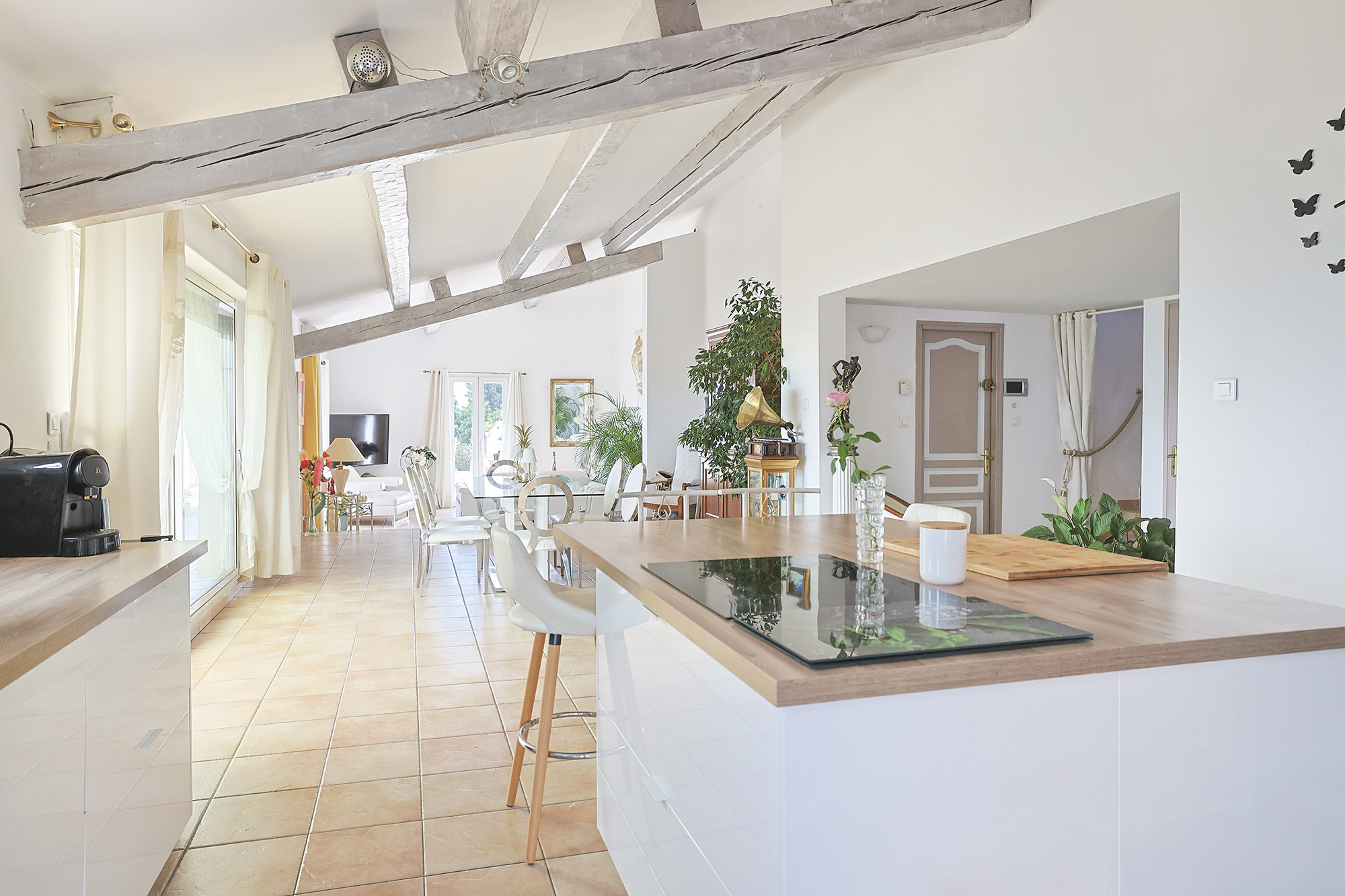 - Au rez-de-chaussée : Une belle pièce de vie de 66 m2 avec cuisine ouverte récente qui donne sur 2 grandes terrasses (dont une avec une partie véranda), et un WC indépendant
