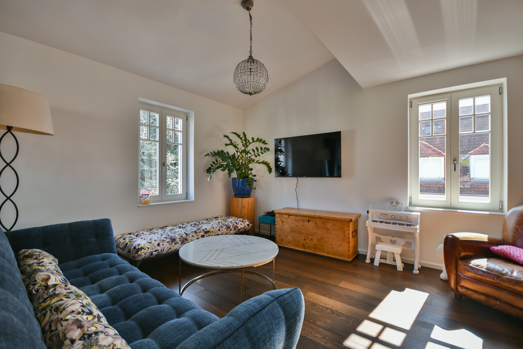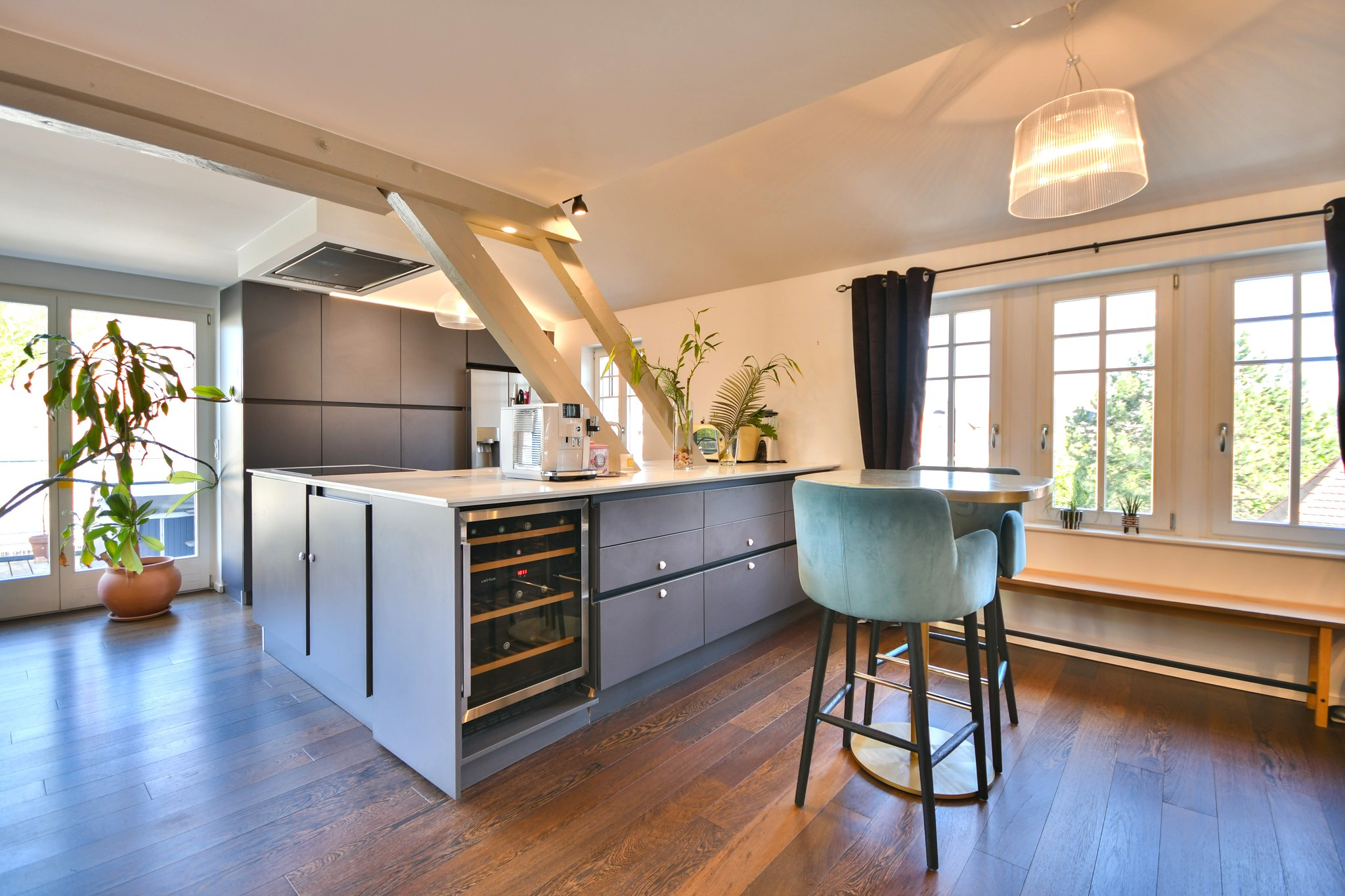 * une vaste pièce de vie de plus de 70 m2 équipée de parquet massif, d'une cuisine haut de gamme ainsi que d'une climatisation réversible pour un confort optimal été comme hiver et une seconde chambre avec sa salle de bain attenante,