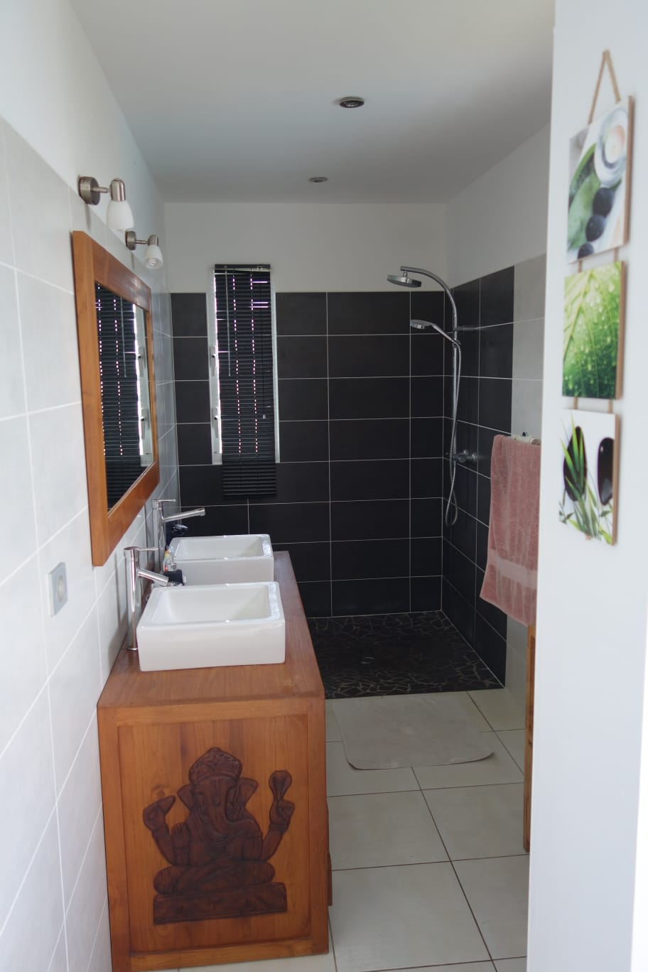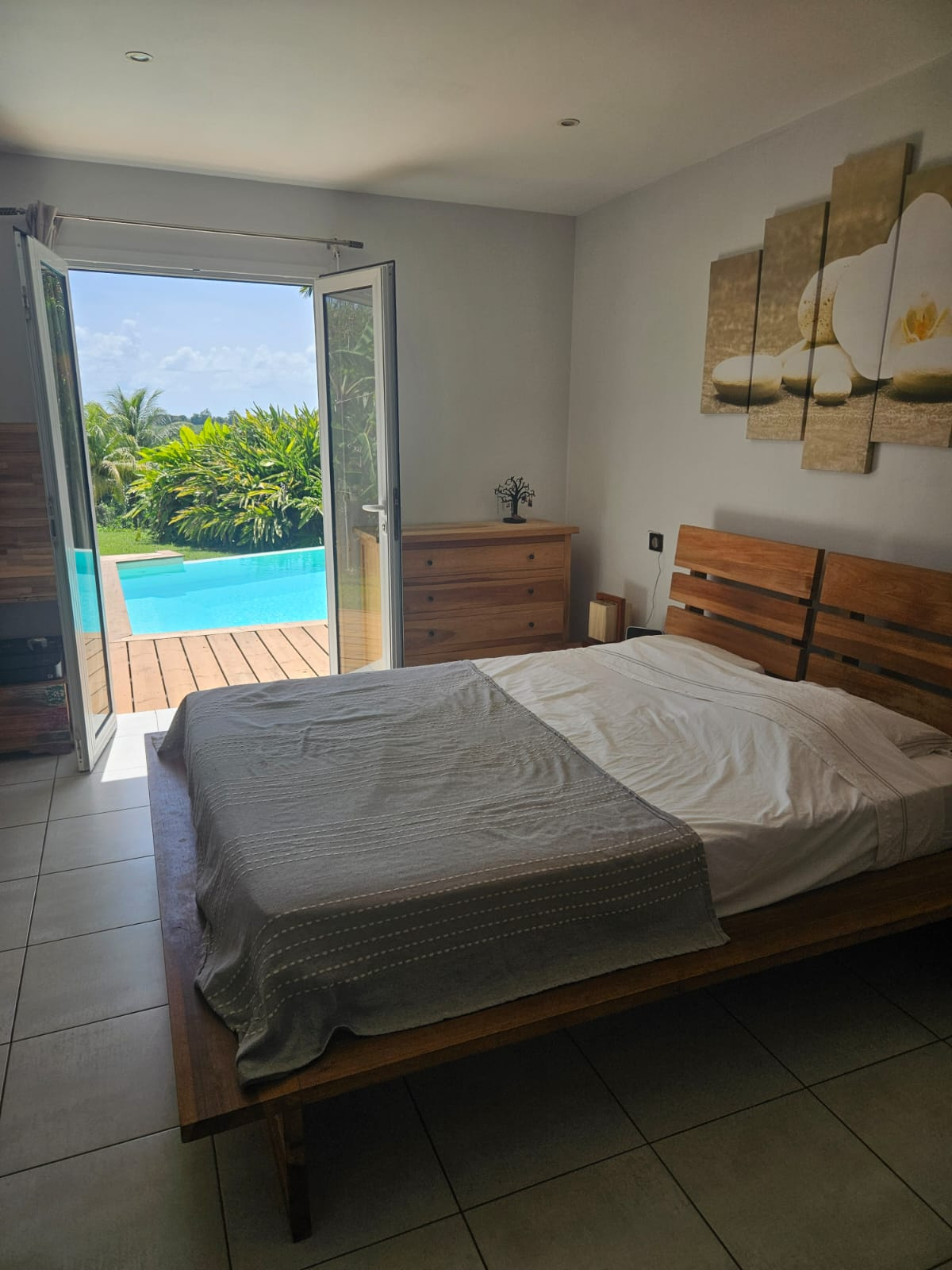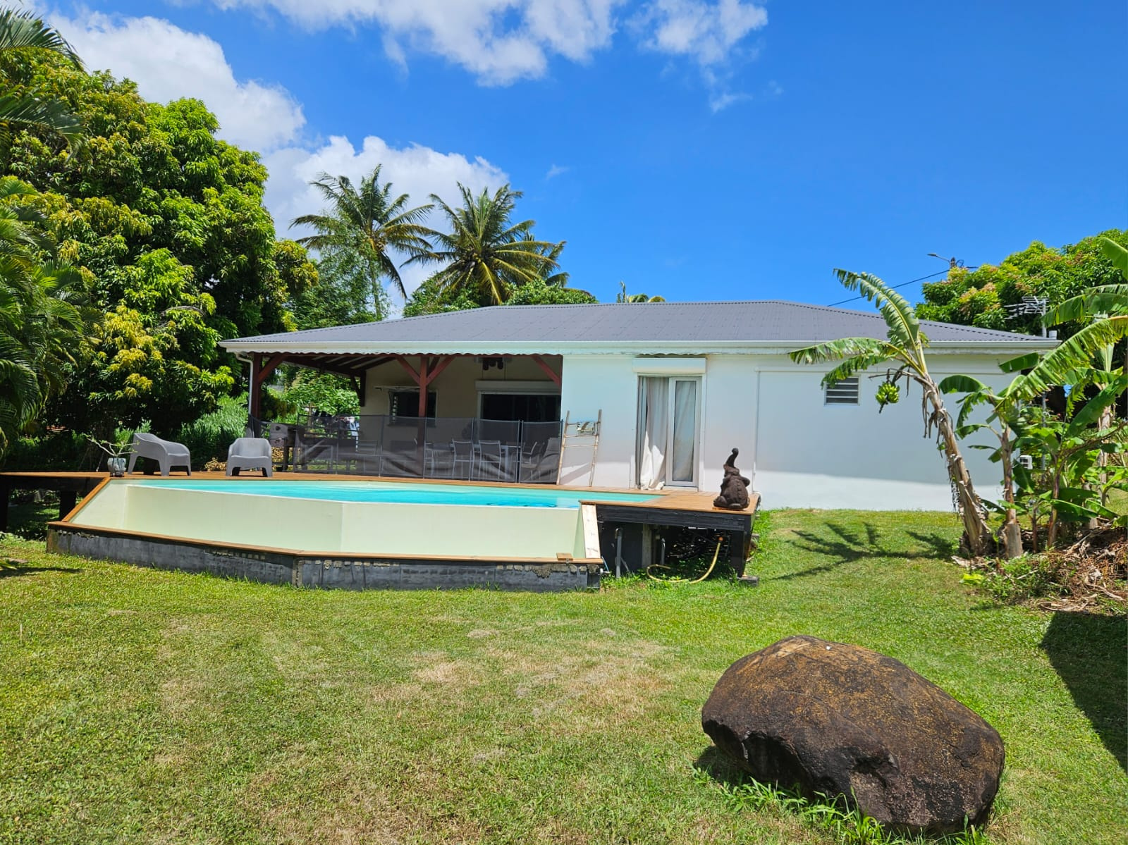 Côté extérieur, vous serez charmé par la piscine à débordement entourée d'un deck neuf, parfaite pour se détendre en toute tranquillité. Le terrain, arboré et fleuri, accueille de nombreux fruitiers tels que manguiers, bananiers, arbre à pain, cocotiers, ainsi que plusieurs plantes médicinales.