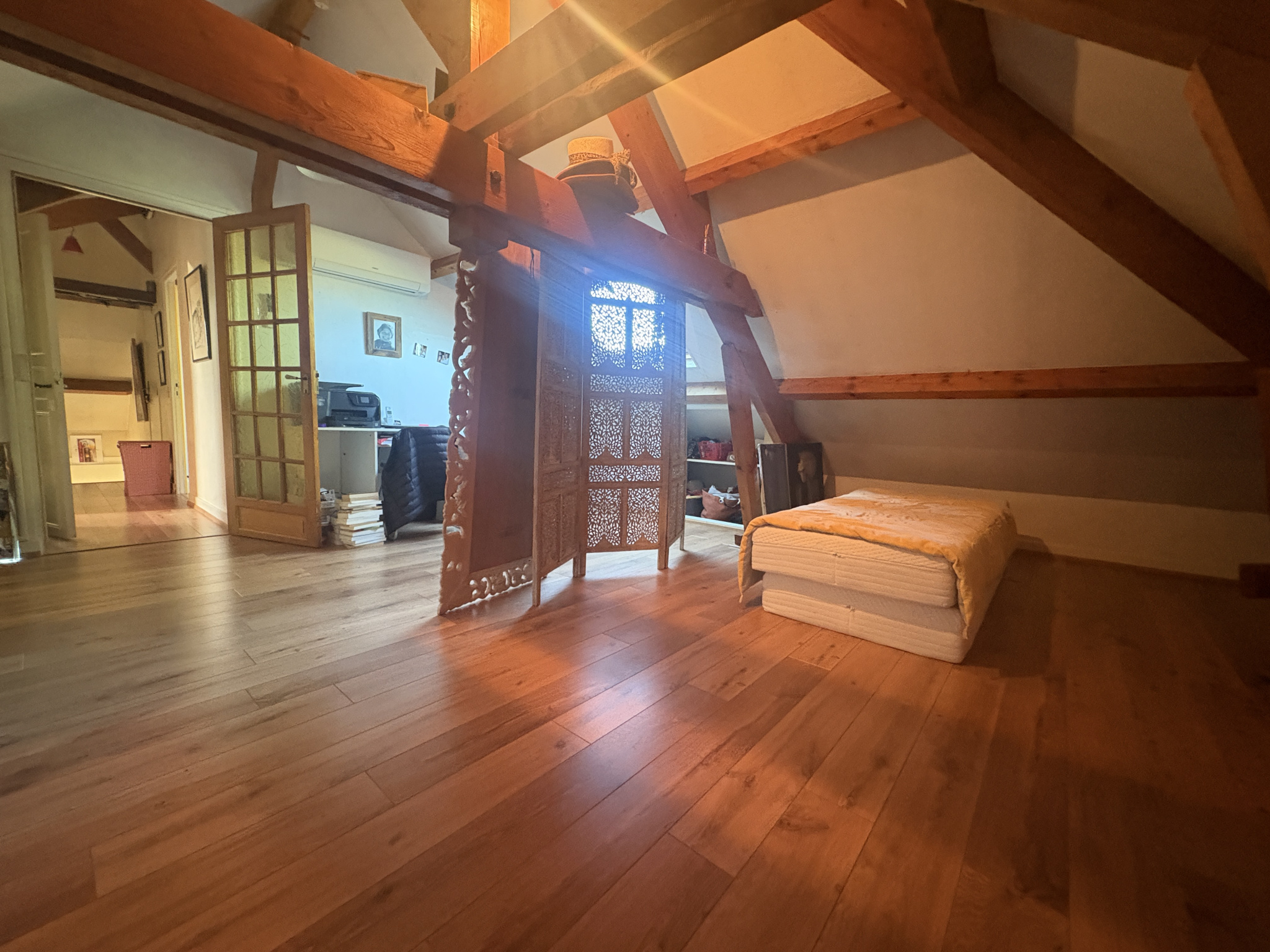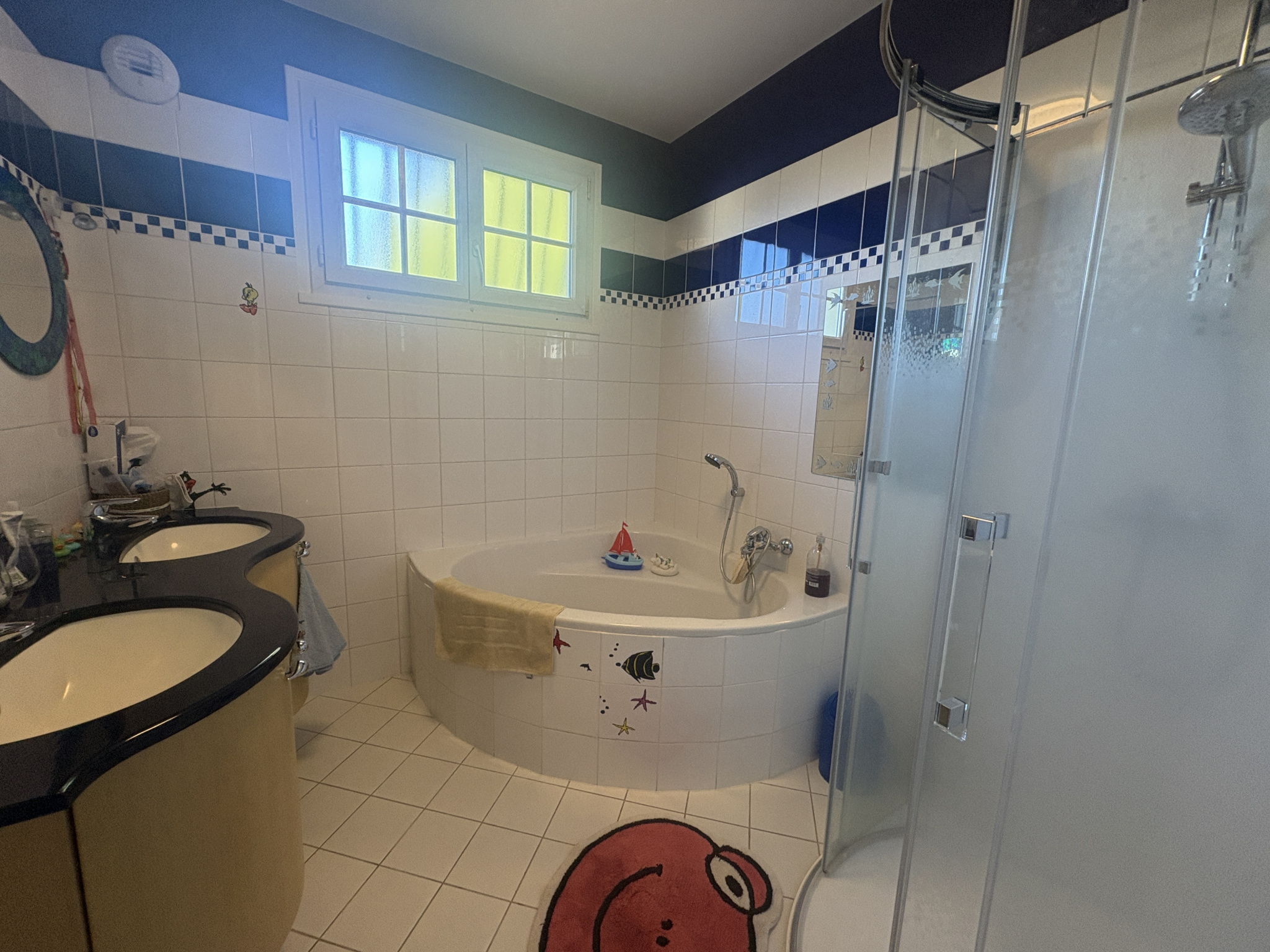 Très jolie maison en très bon état de présentation comprenant entrée lumineuse, salon- séjour avec cheminée moderne, cuisine aménagée et équipée donnant sur grande terrasse d'environ 60m2 avec une vue imprenable sur le jardin, 2 chambres, salle de bains et wc au rdc et à l'étage : grenier, 2 autres chambres et salle d'eau avec 2e wc