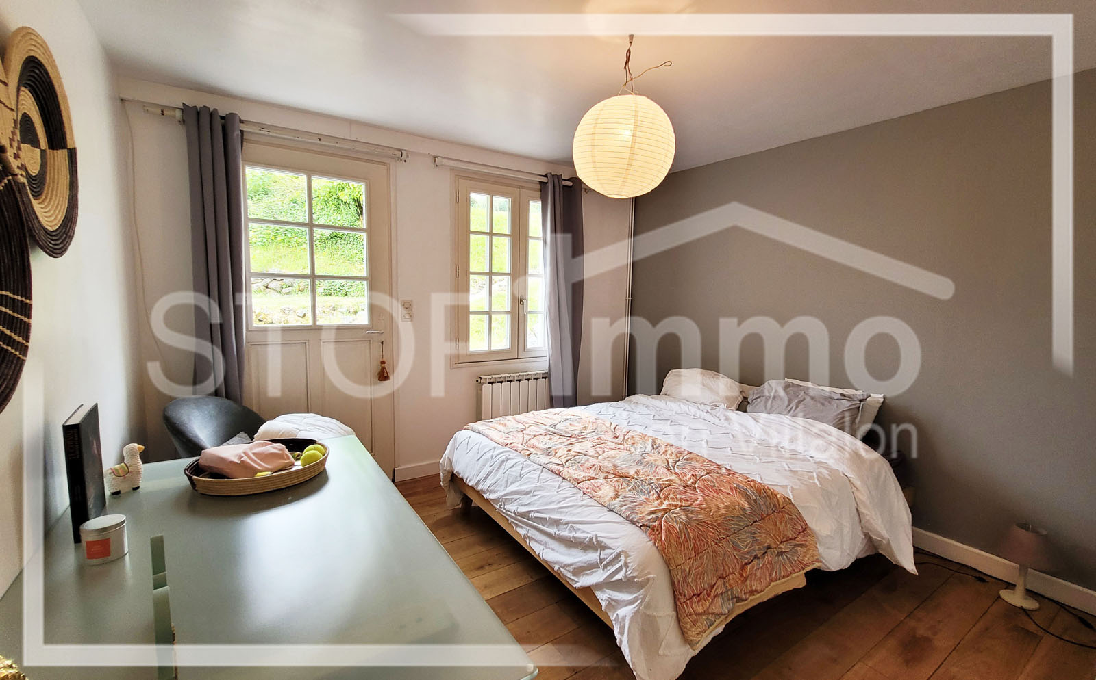 Au rez-de-jardin : - séjour avec cuisine ouverte, avec deux accès extérieurs dont terrasse plein sud, cheminée bois à foyer ouvert dans le salon, - deux chambres de plus de 13 m2 chacune, - dégagemnt avec toilettes indépendants, - salle de douche, - salle de bain avec toilettes.