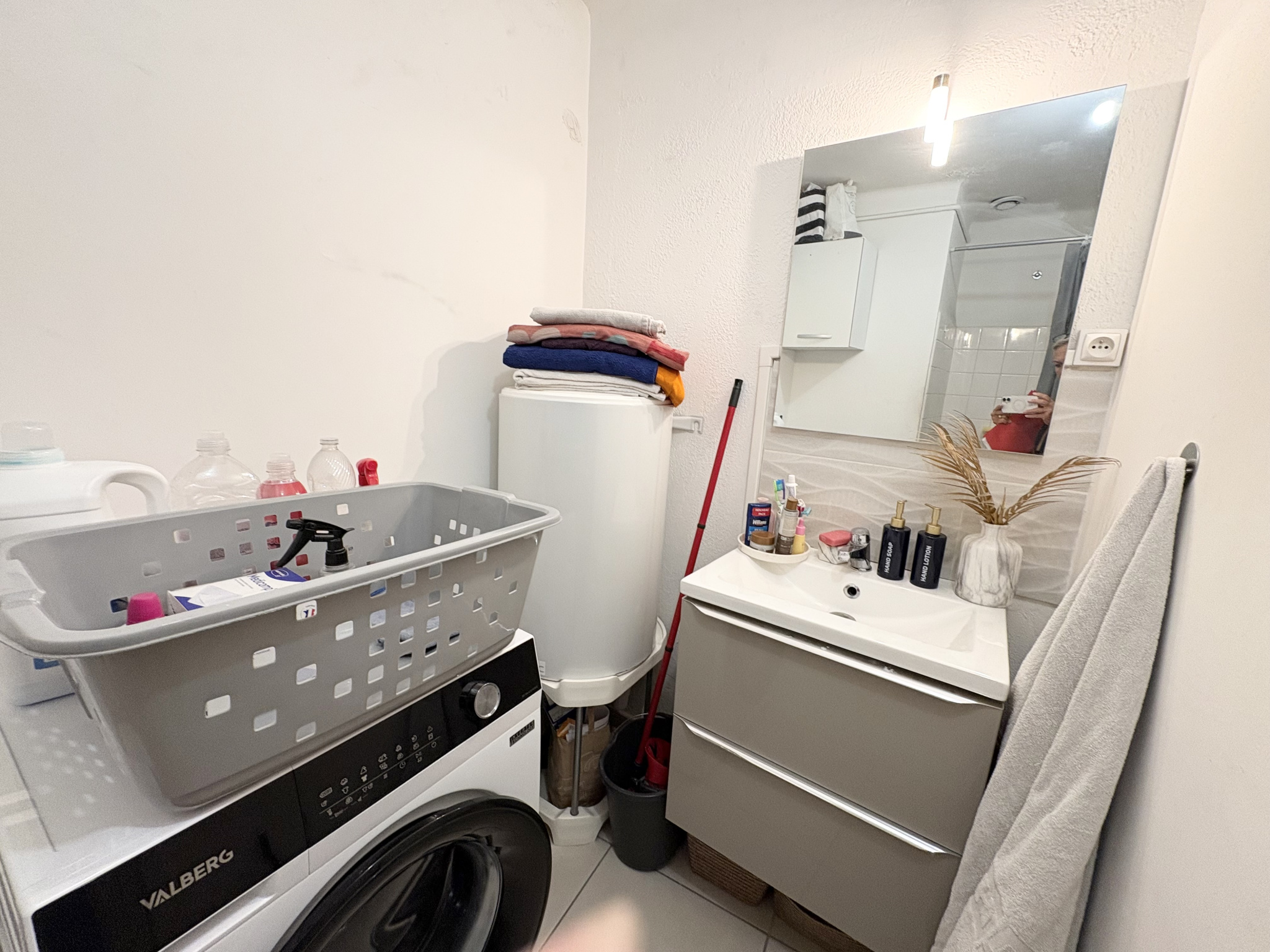 Exclusivité agence Acor Immo , appartement LUMINEUX de 43 m2, composé d' une pièce de vie, d' une cuisine, salle d' eau avec wc et d' une chambre de plus de 15 m2 avec placard, double vitrage