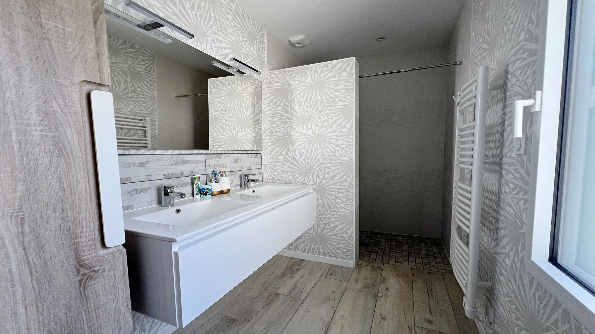 À l'étage, l'espace nuit propose trois chambres avec dressing et une salle de bains avec douche et baignoire, idéale pour toute la famille.
