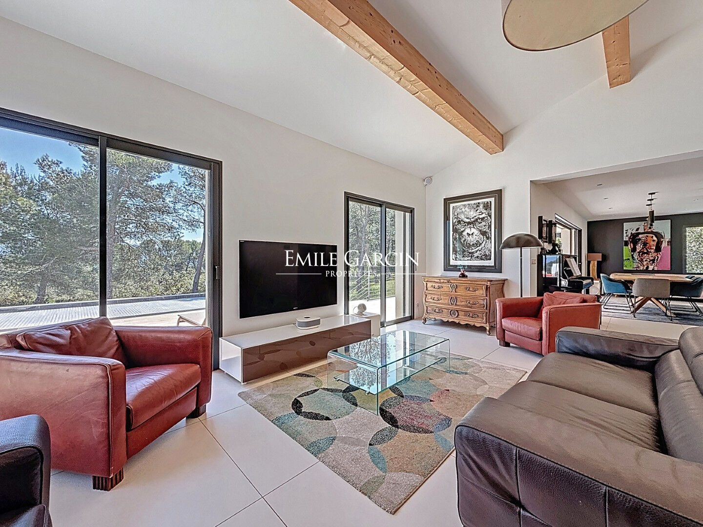 Les pièces de vie, baignées de lumière grâce aux larges baies vitrées, s'ouvrent toutes sur les terrasses et la piscine à la vue dominante sur la vallée du Luberon et le Mont Ventoux.
