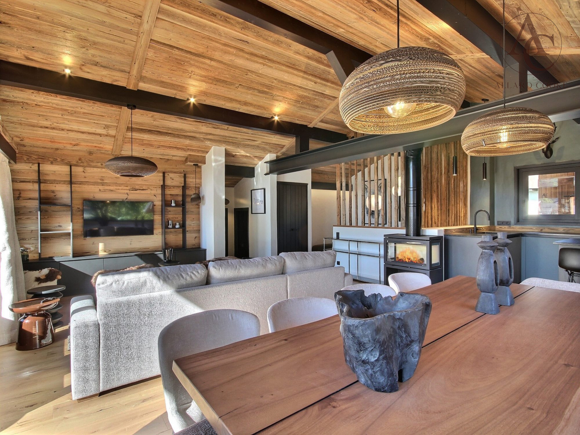 La pièce de vie, lumineuse et conviviale, avec un élégant poêle à bois, se prolonge par un balcon ensoleillé offrant une vue dégagée sur le Val d'Arly.