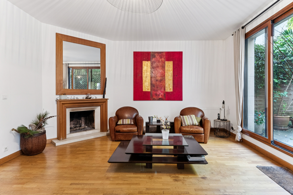 Maison traversante avec jardin sur quatre niveaux d'une superficie totale au sol de 222m² (165,96 m² « Carrez ») avec plus de 100 m² d'espaces extérieurs. Calme absolu et lumineux.