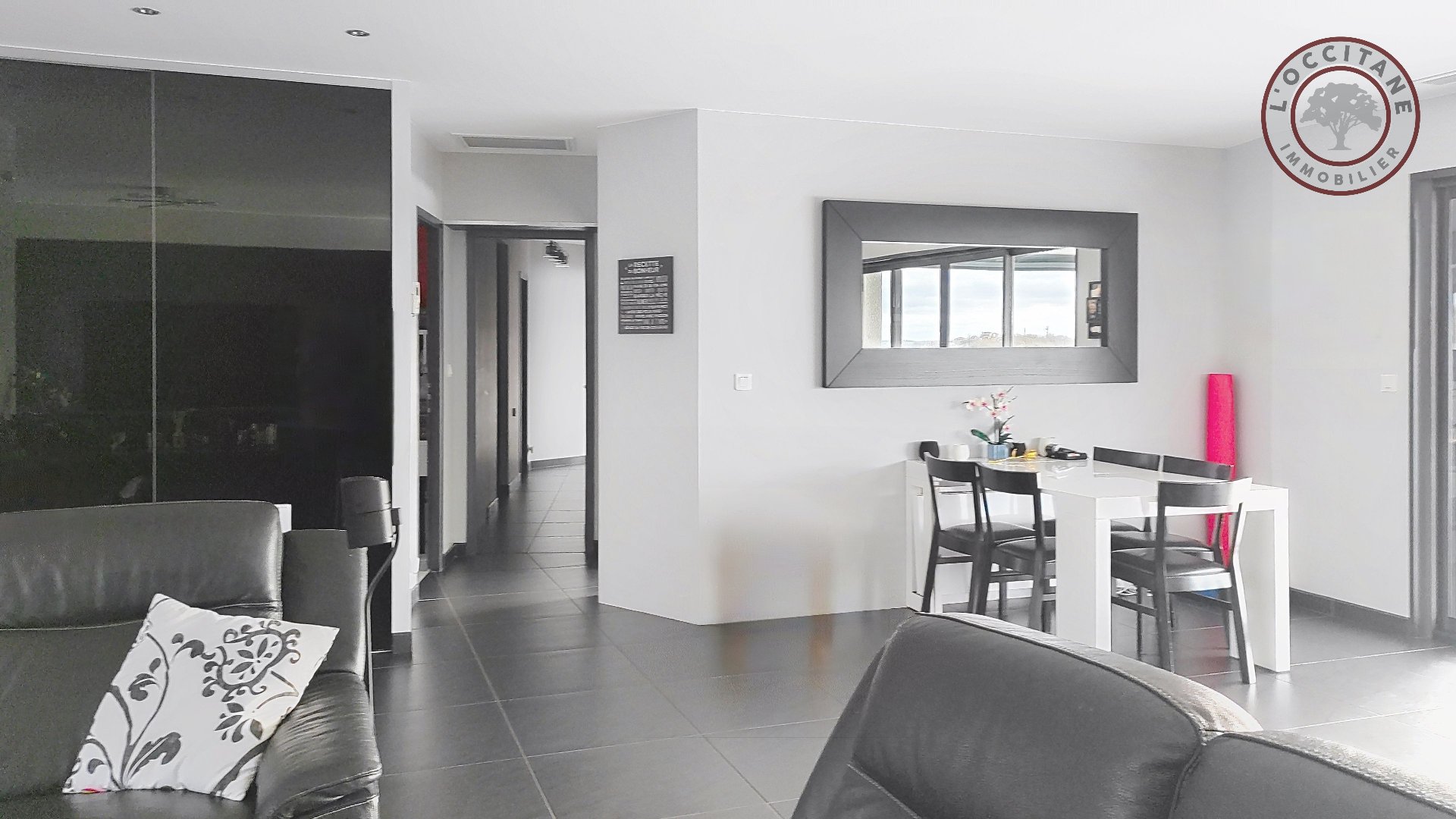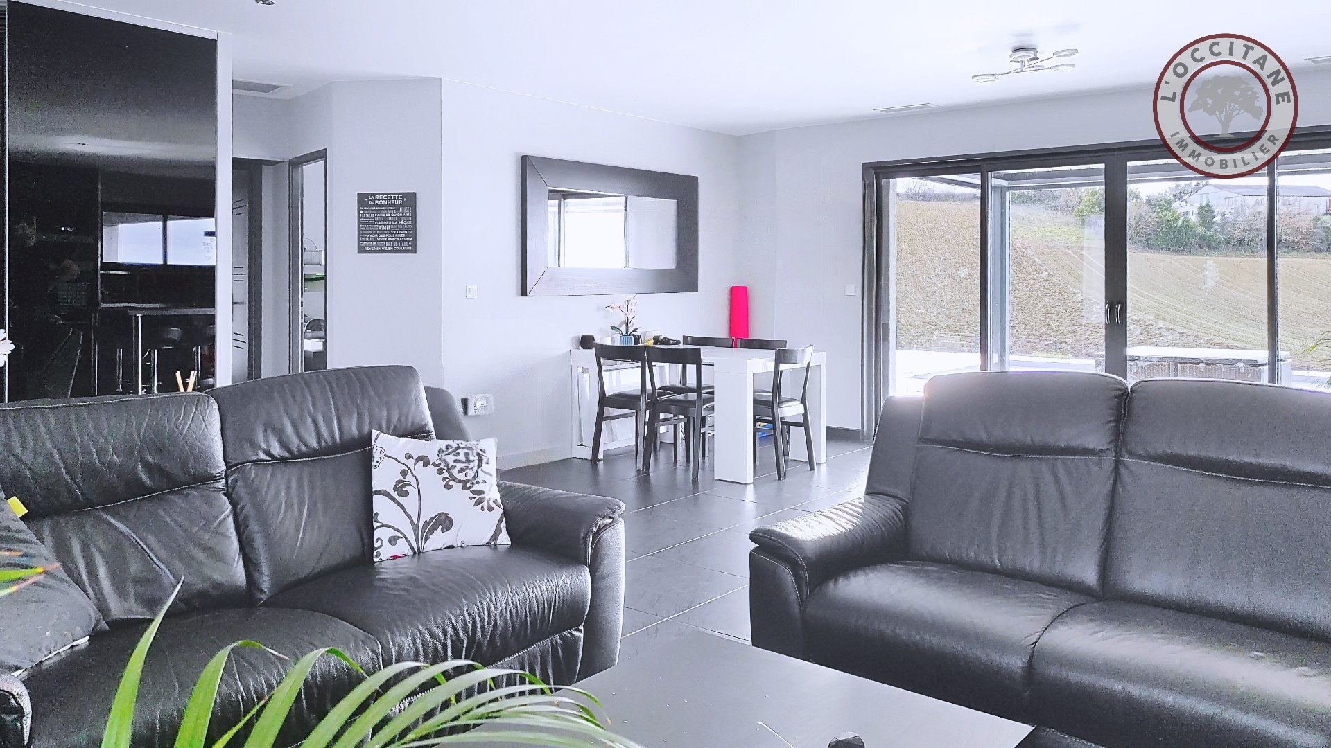 Agréable pièce à vivre traversante avec baie vitrée à galandage, belle cuisine entièrement équipée ouverte, cellier attenant.