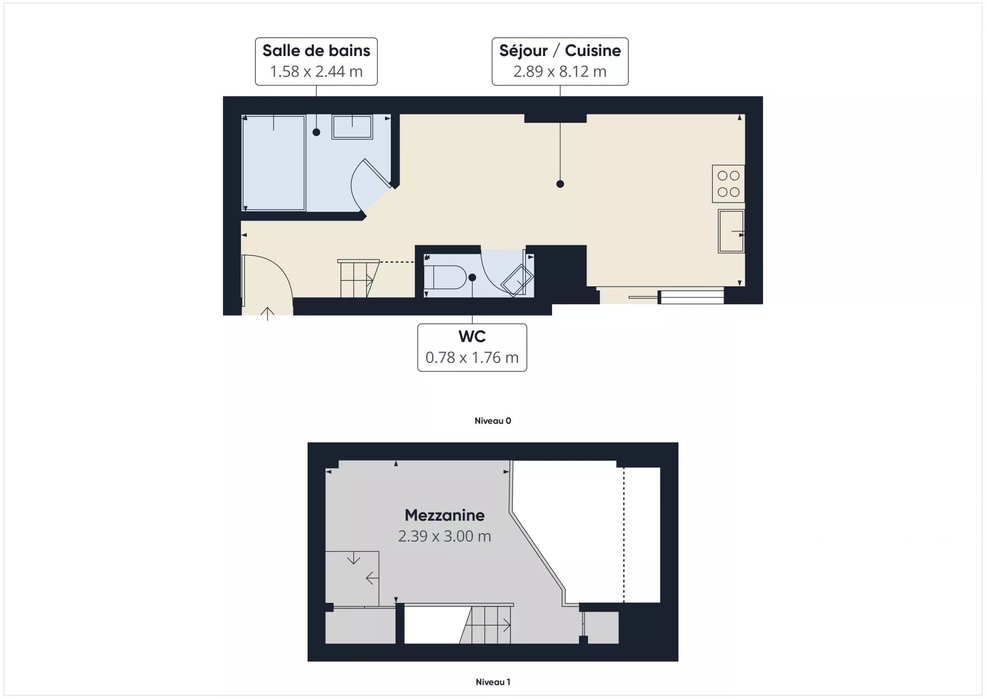 Séjour avec cuisine, grande salle de bains, WC séparé, mezzanine avec rangements pouvant accueillir un lit.