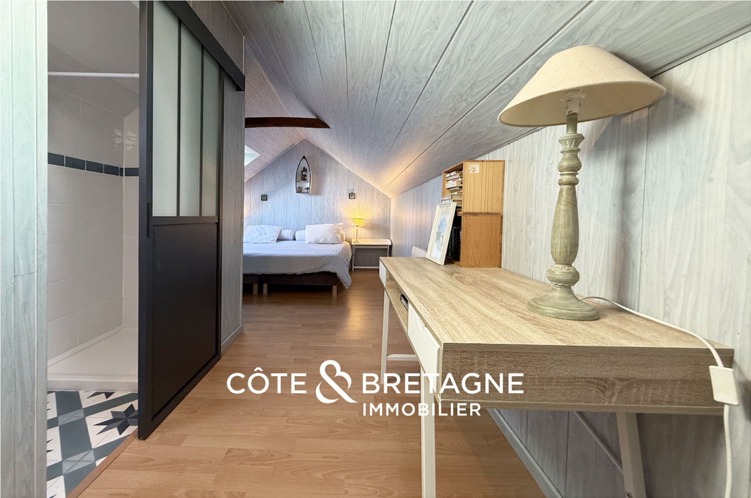 Les combles, entièrement aménagés, constituent un véritable atout. La hauteur sous plafond et les poutres apparentes confèrent à cette pièce un charme certain. Cet espace polyvalent peut accueillir un bureau, une salle de jeux ou encore une quatrième chambre selon vos envies.Une fenêtre offre également une vue dégagée permettant d'apercevoir la mer, apportant une vraie valeur ajoutée à cet espace sous les toits.