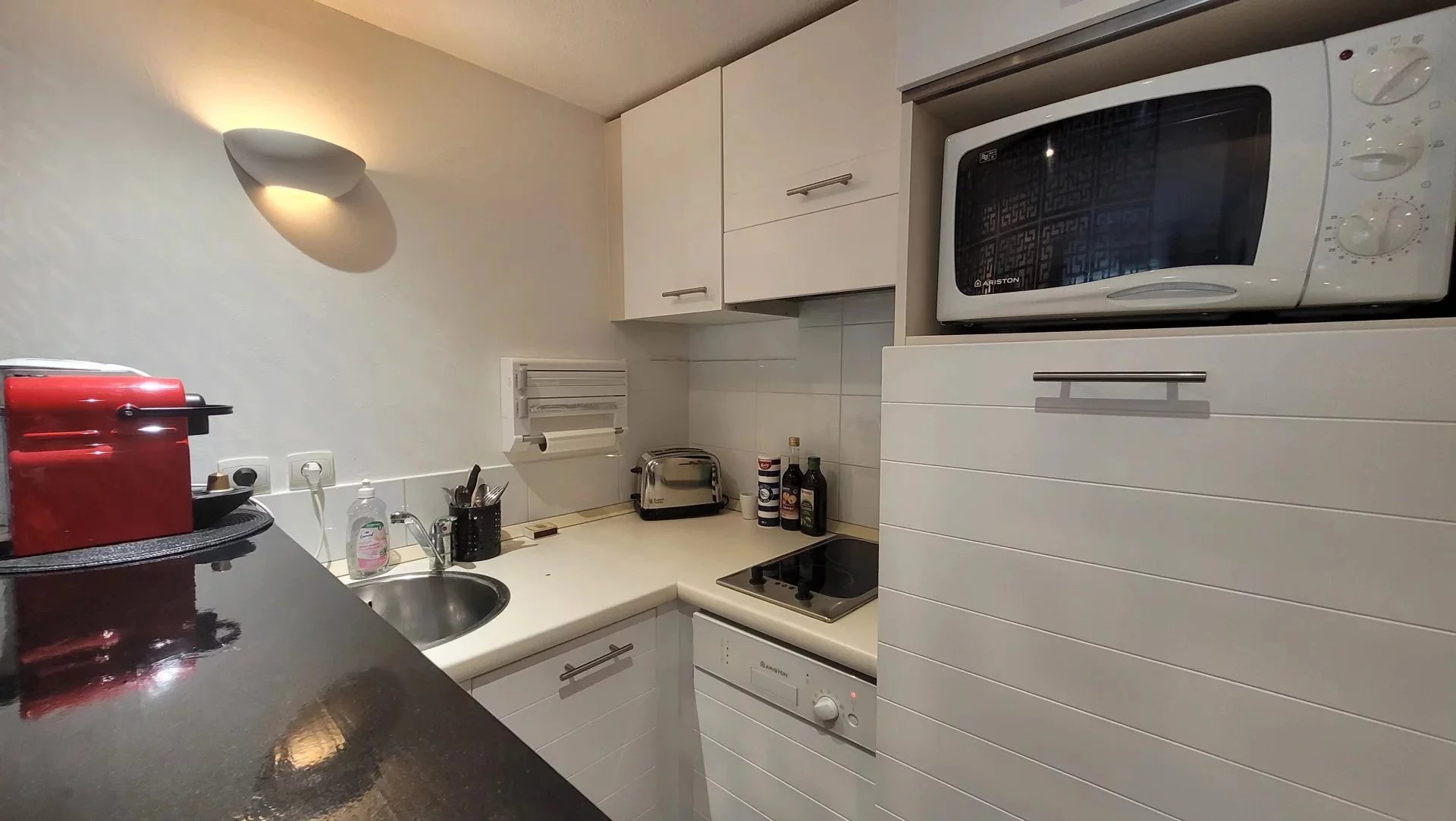 Composé d'un séjour avec sa kitchenette, d'une chambre et placard, un espace supplémentaire dressing ou bureau, d'une salle de bains et wc séparé.