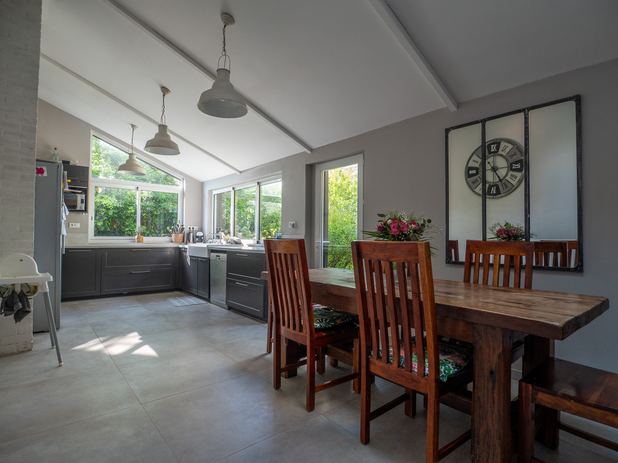 Double salon avec cheminée à feu de bois, cuisine équipée.