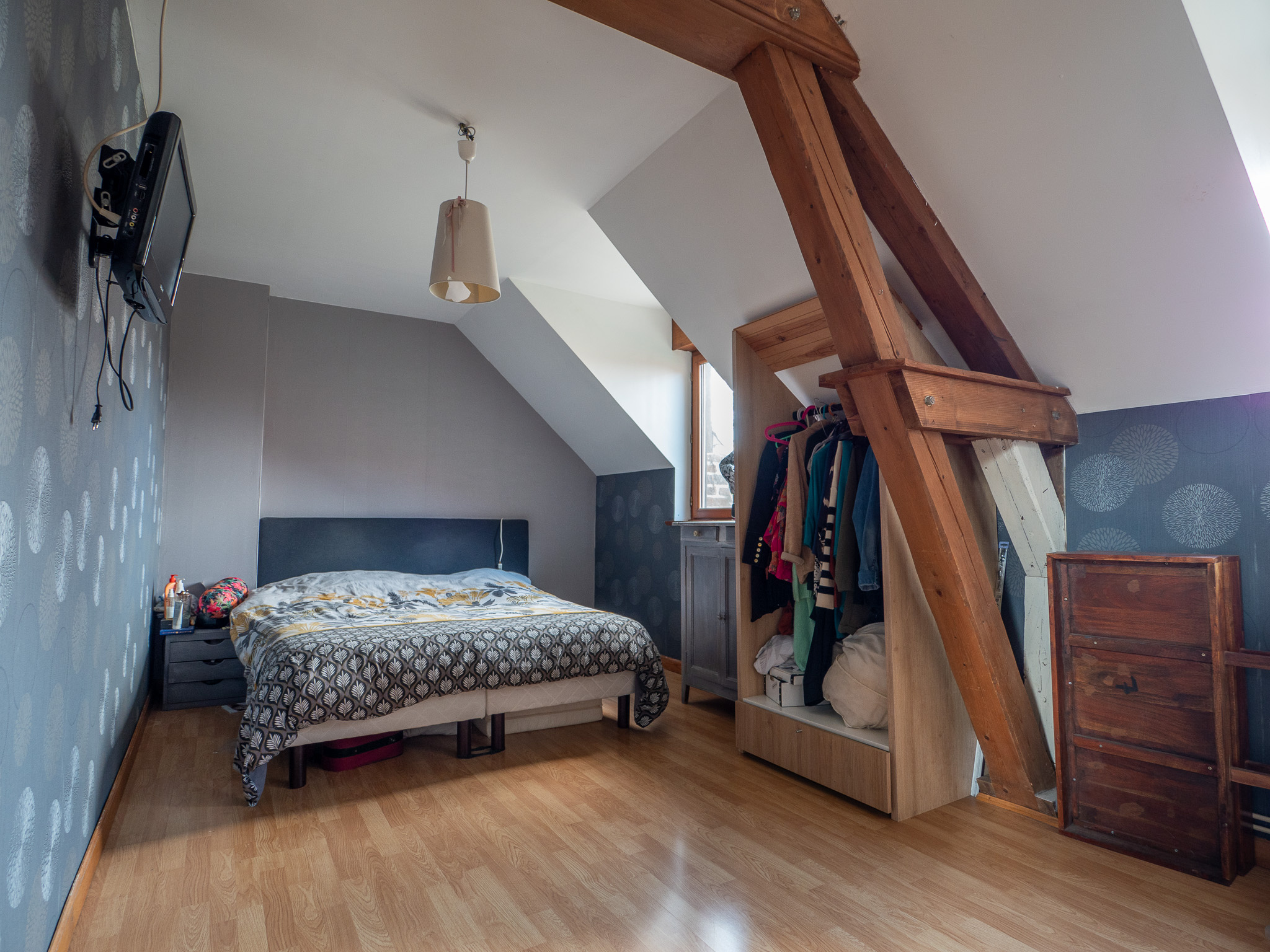 À l'étage : 4 grandes chambres dont une avec mezzanine, salle de bain.