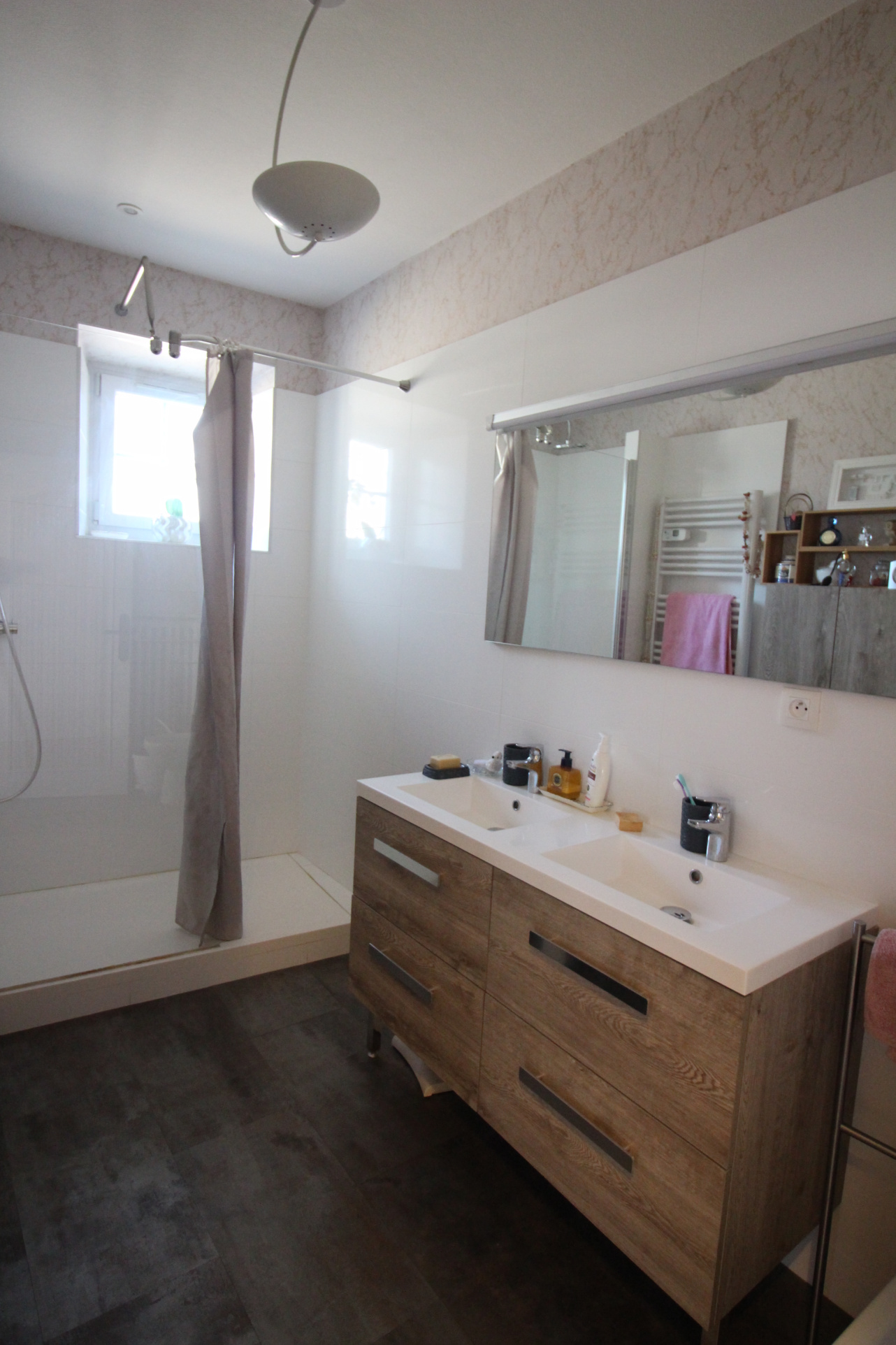 A l'étage , dégagement/hall avec rangement, séjour salle à manger , cuisine aménagée, couloir, 3 chambres , salle de douche et wc séparé.