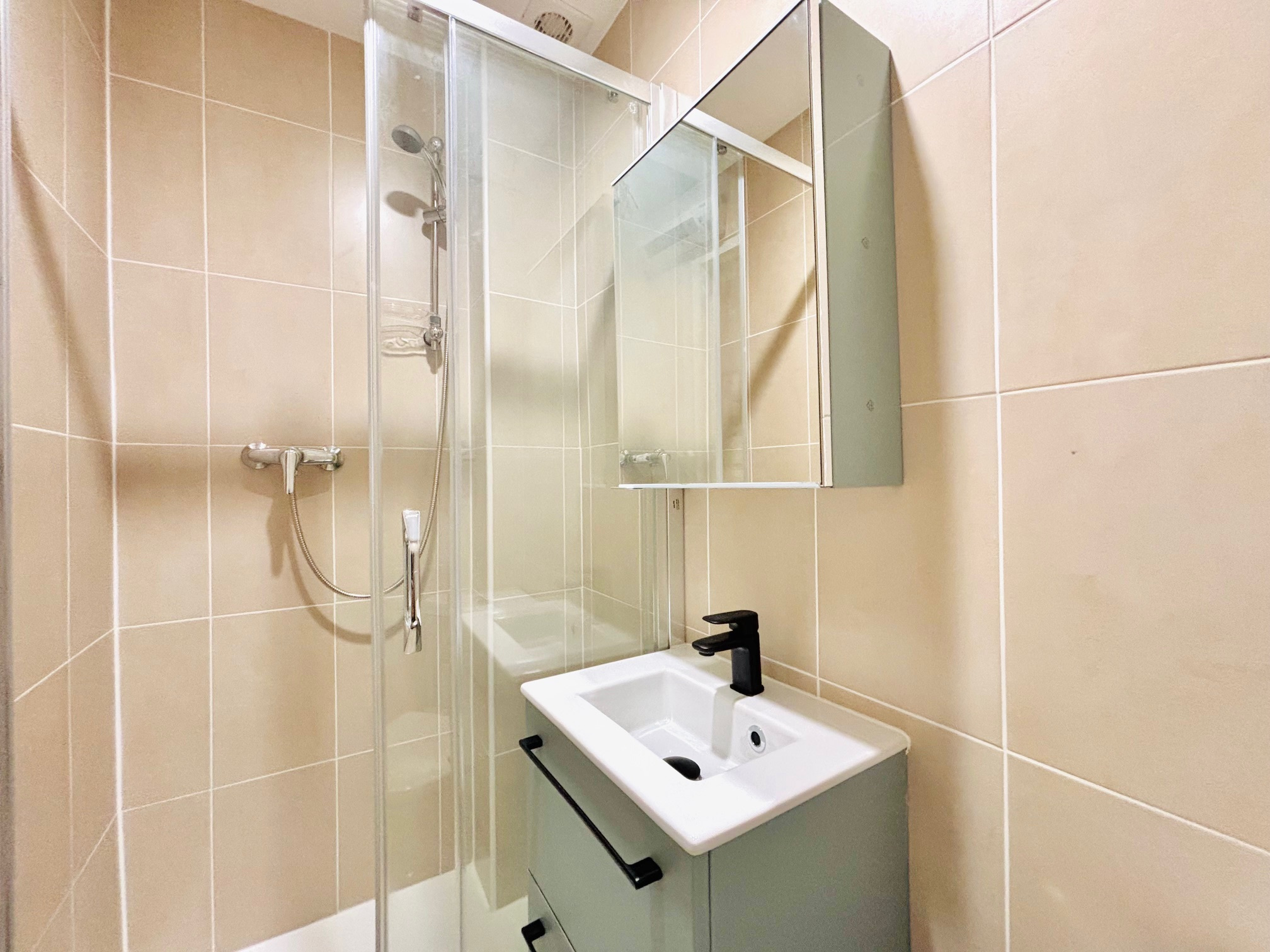 L'appartement se compose d'une petite entrée avec placard, d'une salle de douche avec WC, d'un agréable séjour avec coin cuisine aménagé ouvrant sur un balcon au sud, et d'une grande chambre. L'ensemble équipée de double vitrage et de la climatisation.