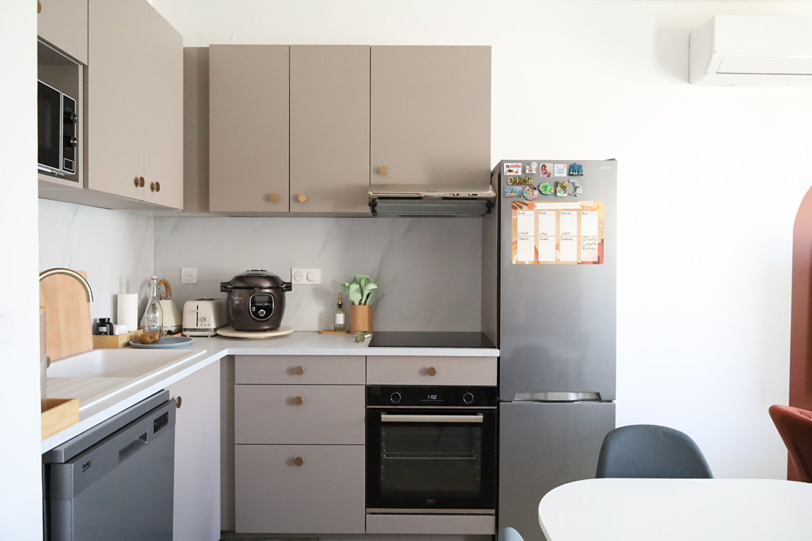 Dès l'entrée, une pièce de vie lumineuse avec cuisine équipée, salon chaleureux et espace repas parfaitement intégré.