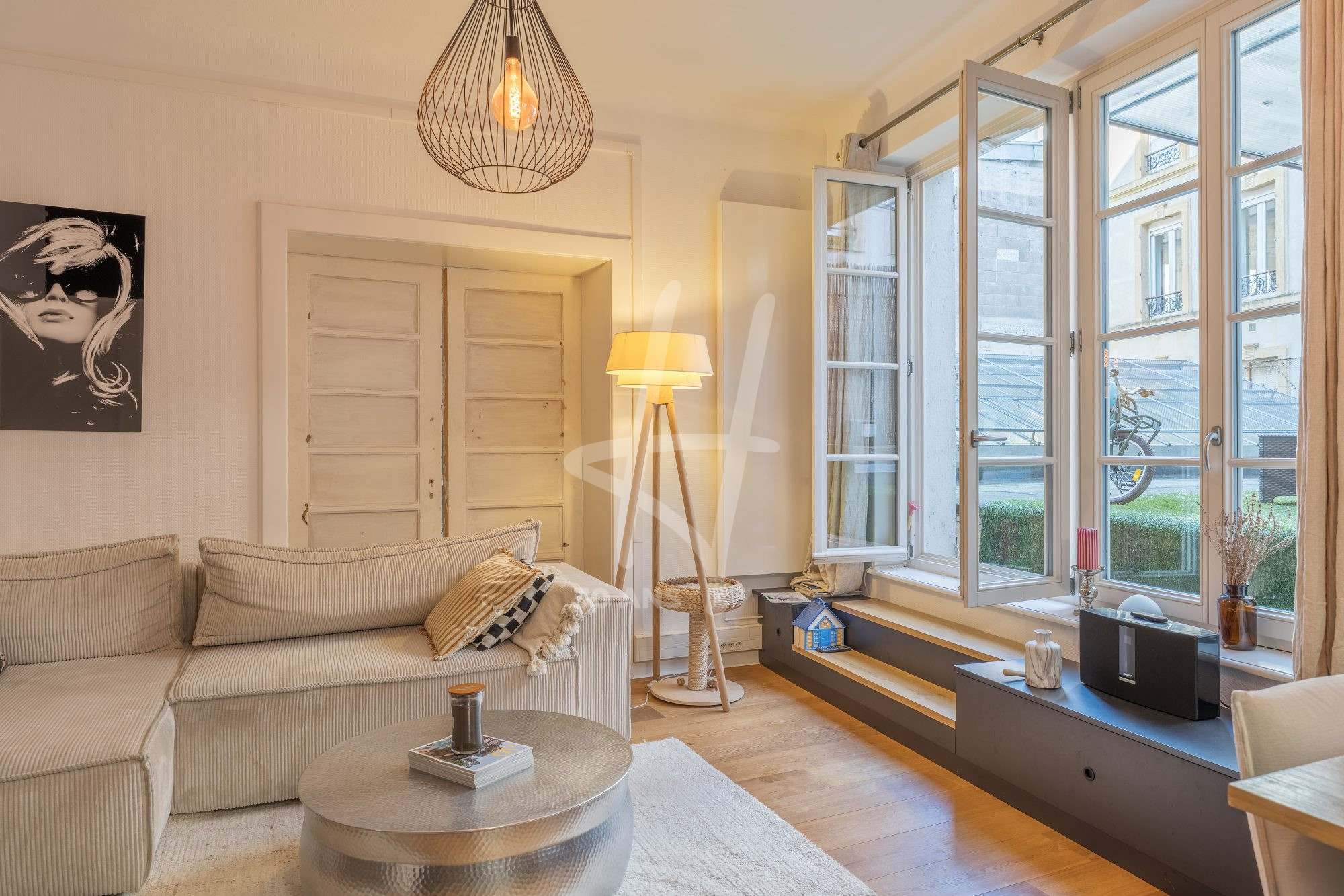 Hyper centre Metz, T4 de 92 m², rénové avec goût, séjour lumineux donnant sur un extérieur, parquet massif, hauteur 3 m, 2 ch, immeuble 1915 en excellent état. Parking République à 500 m. DPE D, faibles charges 115 ?/mois.