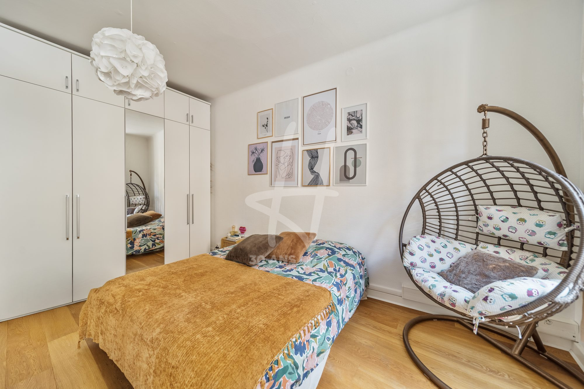 L'appartement comprend deux grandes chambres, une salle de bains avec baignoire et douche, un WC indépendant et de nombreux rangements intégrés sur mesure.