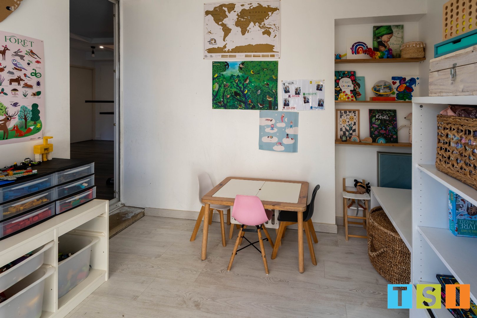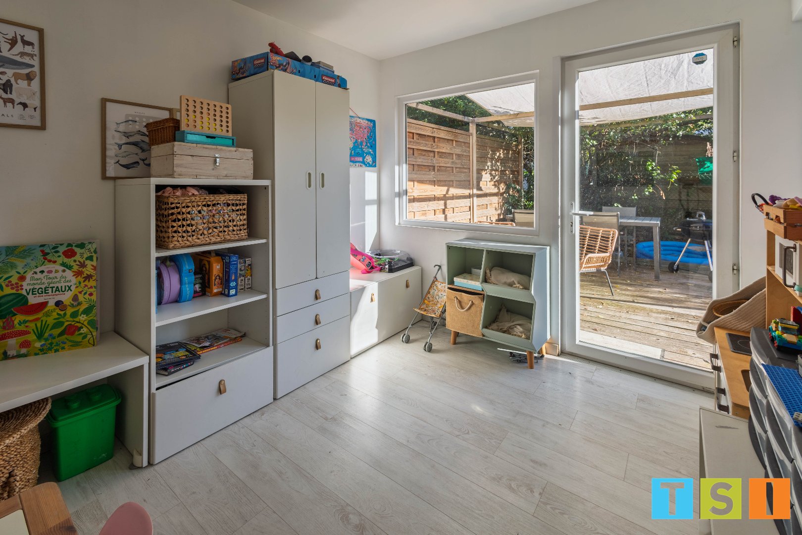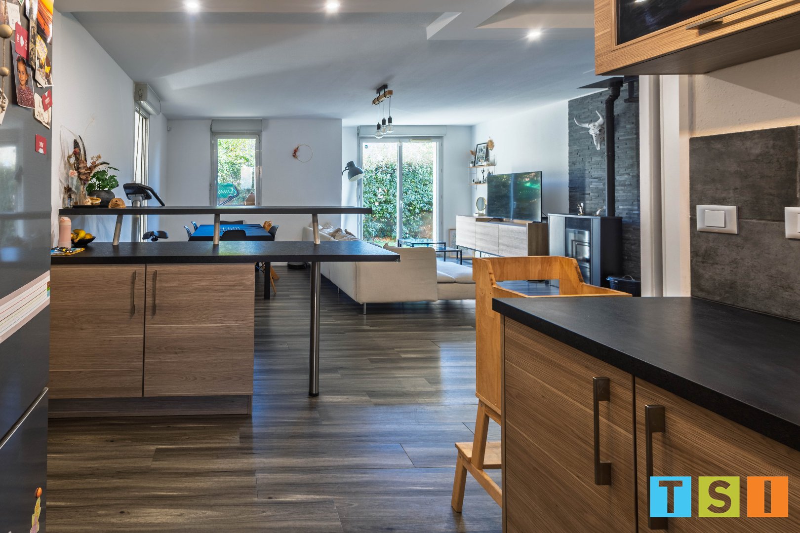 Au RDC : la lumineuse pièce à vivre de 40 m², avec cuisine aménagée et équipée et poele à pellets, un bureau (ou salle de jeu, ou chambre) de 9 m², la buanderie, le garage à 2 roues avec mezzanine de rangement et des WC indépendants.