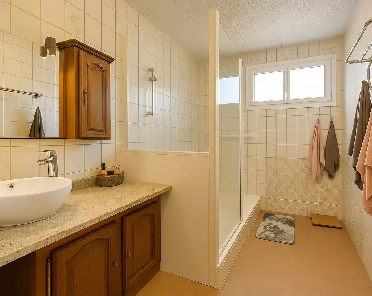 À l'étage, un palier dessert une salle d'eau avec grande douche, un WC séparé, et trois chambres confortables.