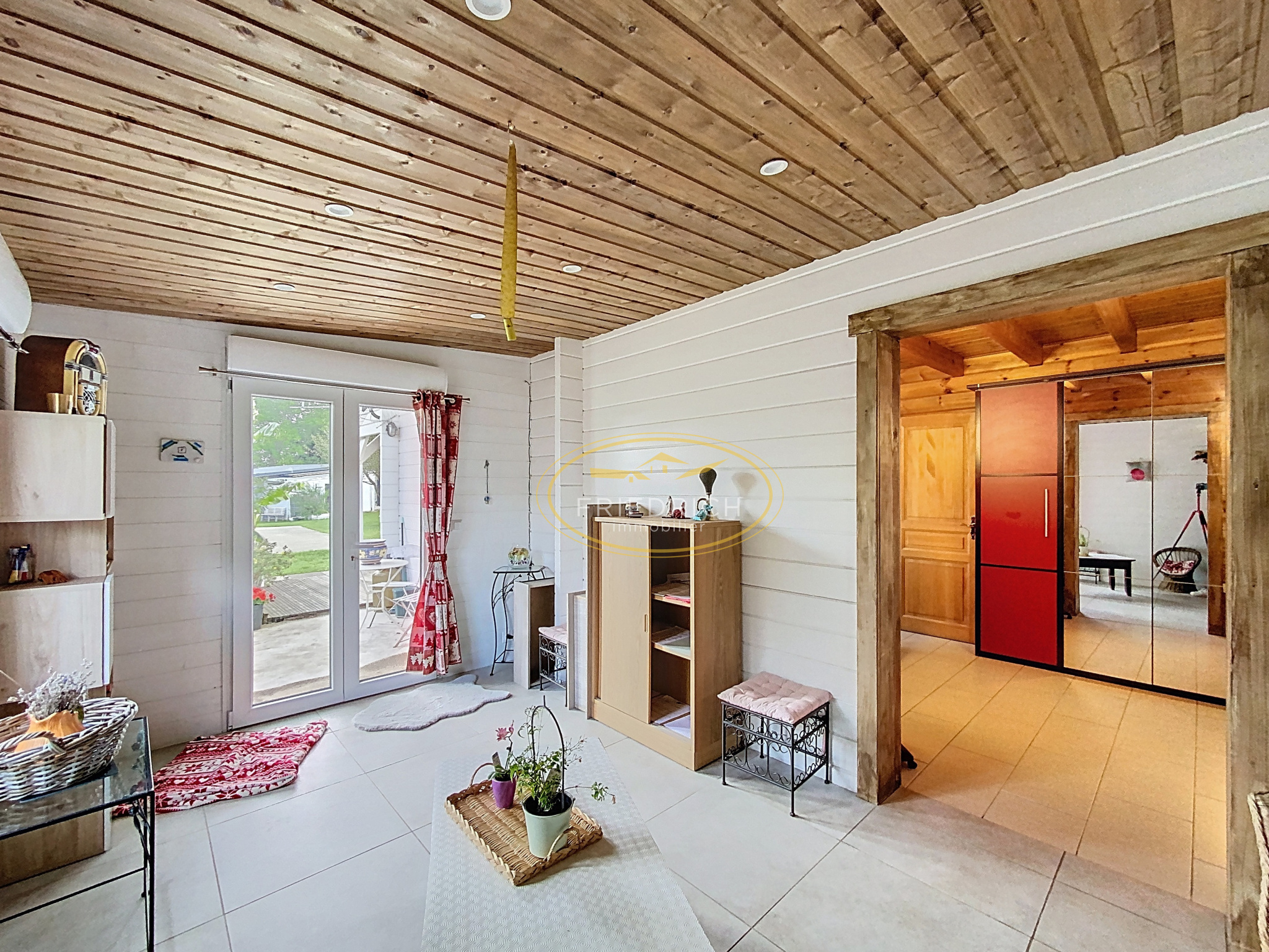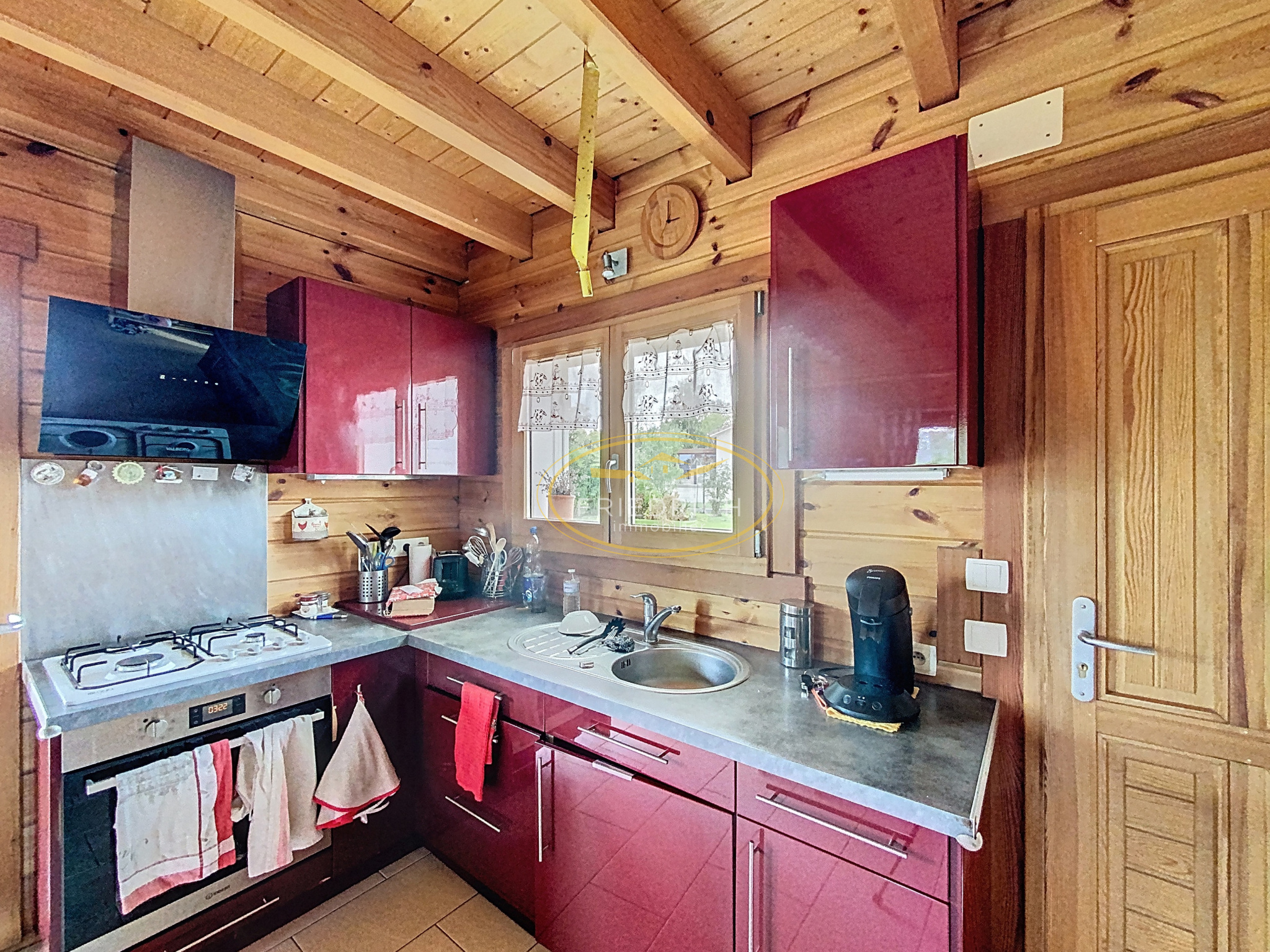 - Entrée sur espace cuisine aménagée / séjour (24,20m2), sol carrelage. Eléments haut et bas, évier inox 1 bac, four électrique, plaque 4 feux gaz (bouteille), hotte. Poêle à bois faisant office de chauffage principale.