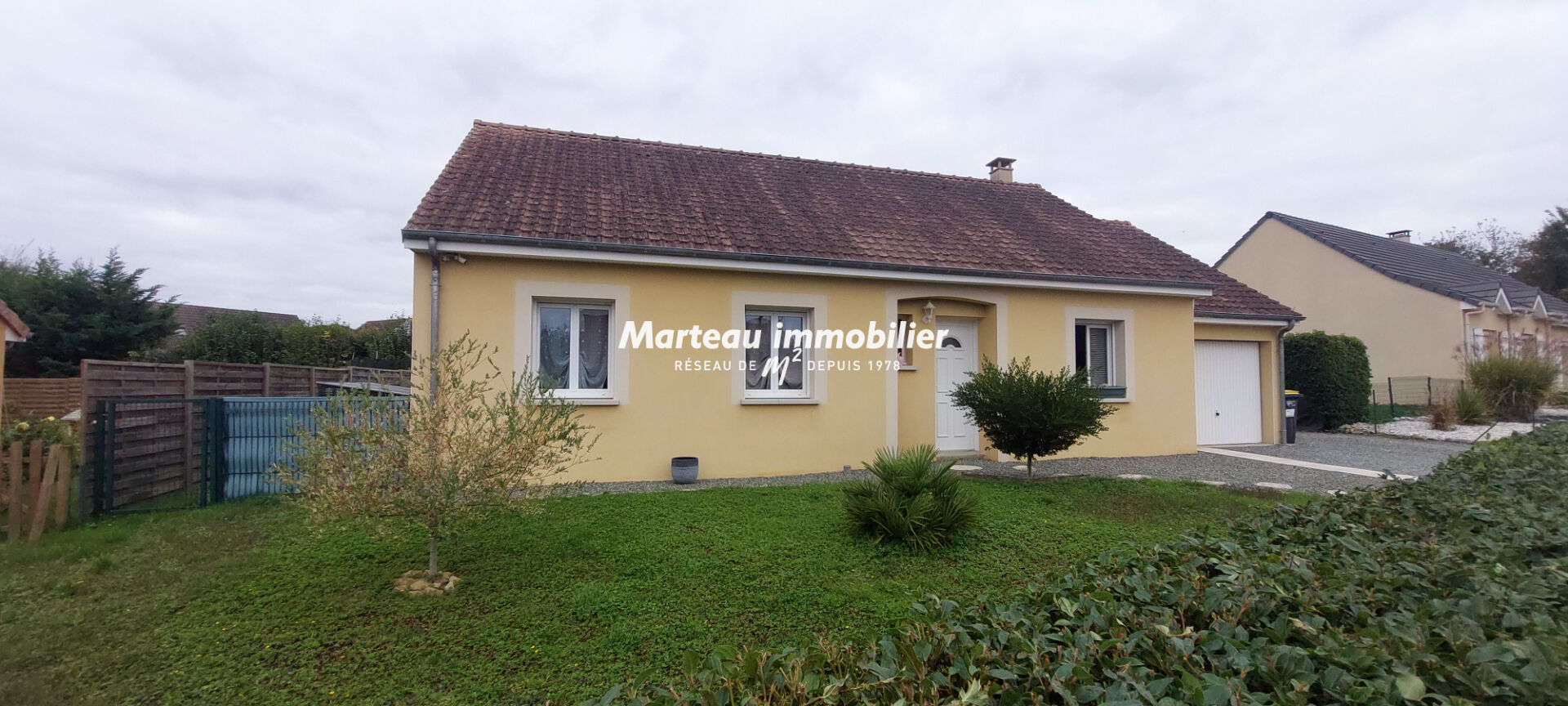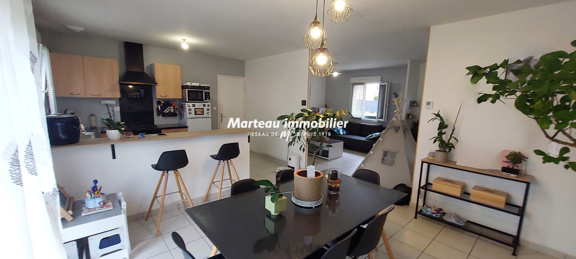 Maison de plain-pied d'environ 82 m² comprenant trois chambres confortables, une salle d'eau, un salon-séjour lumineux ouvert sur une cuisine équipée et aménagée.