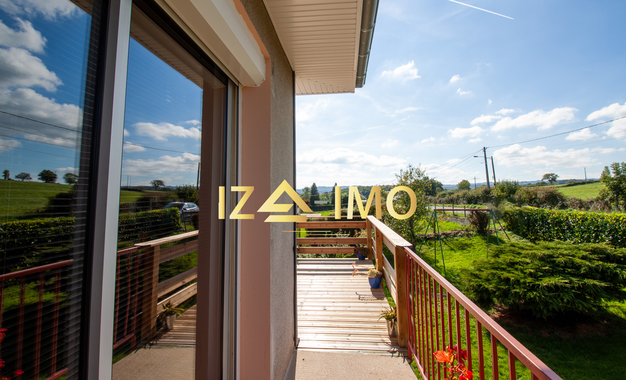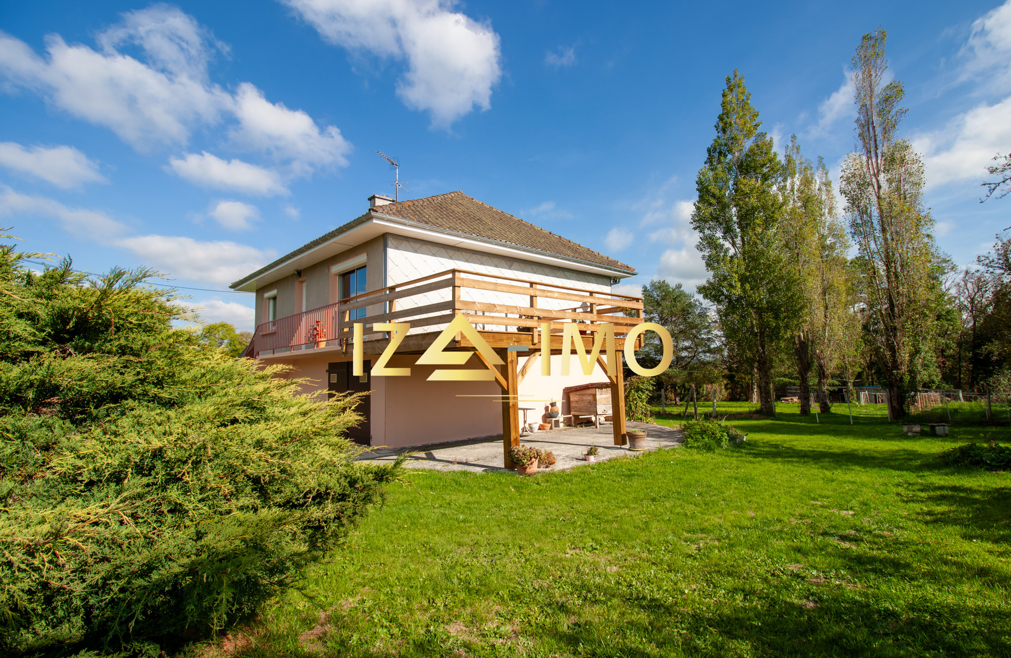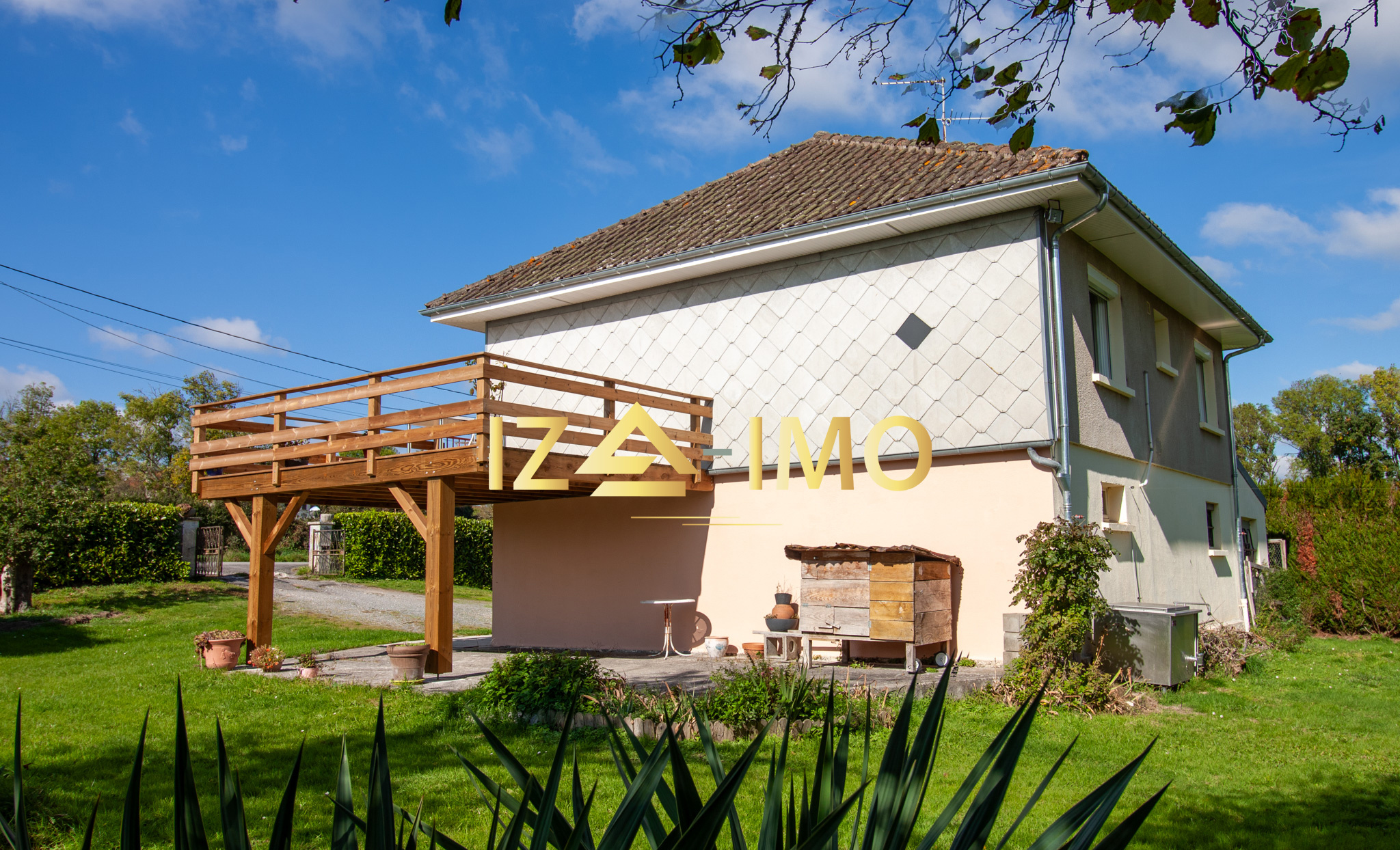 Une terrasse en bois neuve, construite sur pilotis, accessible directement depuis la pièce de vie. Véritable espace de détente, elle vous permet de profiter des repas en extérieur tout en admirant une vue dégagée exceptionnelle sur la nature environnante.