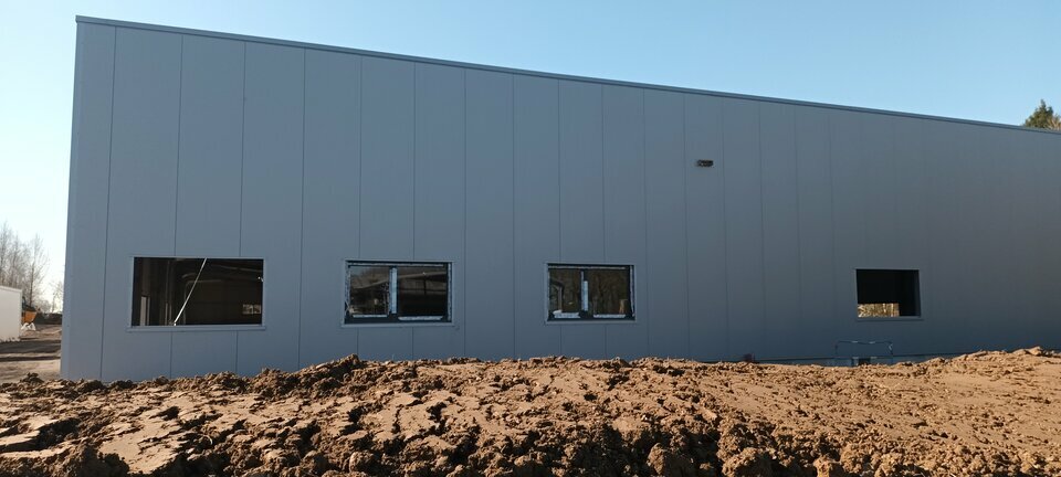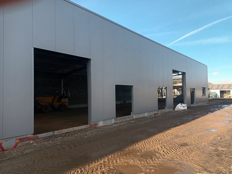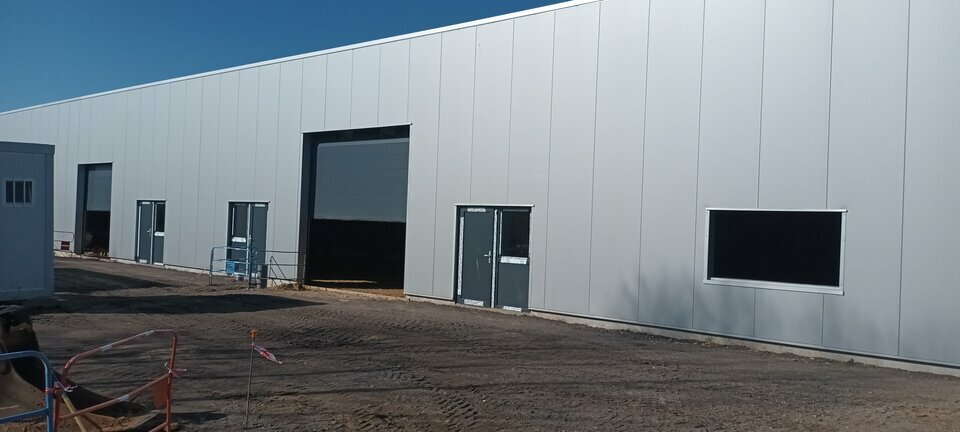 L'accès se fera par une porte sectionnelle électrique de L 3 x H 3,5 m et une porte de service.* Construction en bardage double peau, charpente métallique et toiture en bac acier isolé + panneaux photovoltaïques.