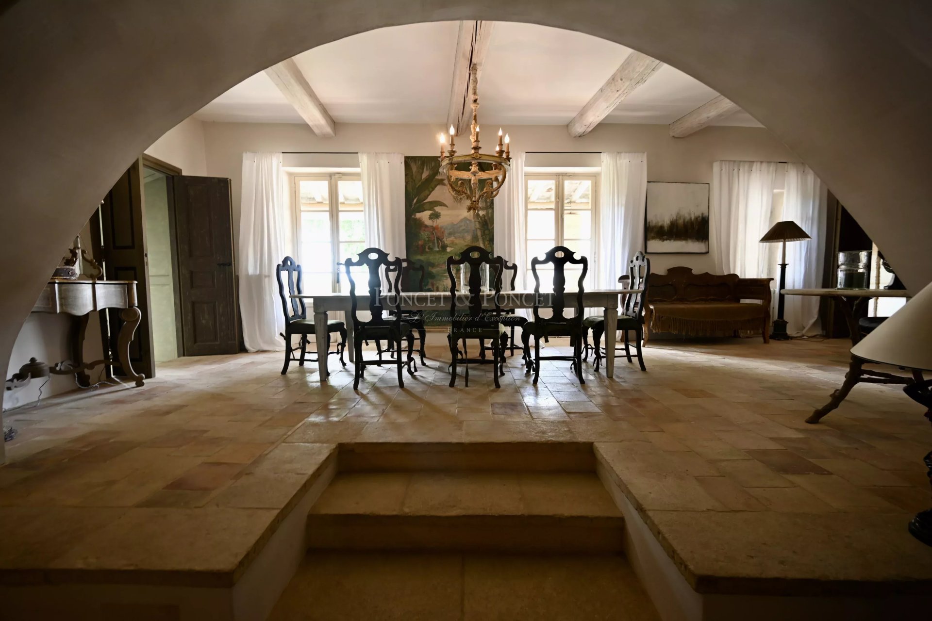 Cette pièce majestueuse séduit par sa hauteur sous plafond, ses poutres apparentes, son sol en béton ciré, et surtout par ses quatre grandes baies vitrées à montants métalliques qui inondent l’espace de lumière. Véritable orangerie provençale, elle marie harmonieusement authenticité et modernité, dans une...