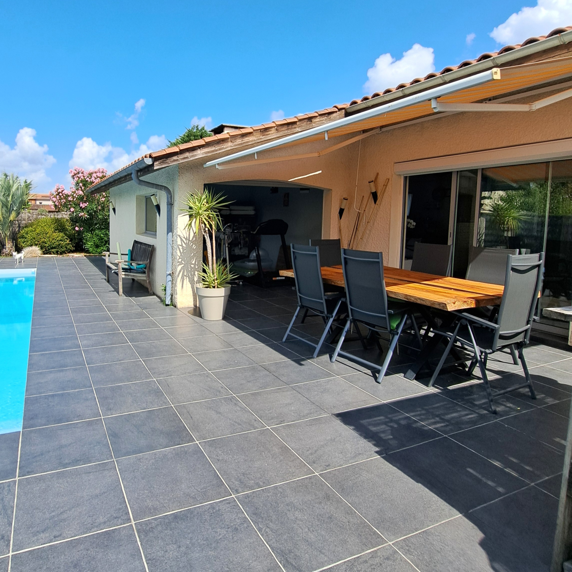À l'extérieur, une terrasse vous invite à profiter des beaux jours autour d'une sublime piscine de 4 x8 m, à l'eau cristalline.