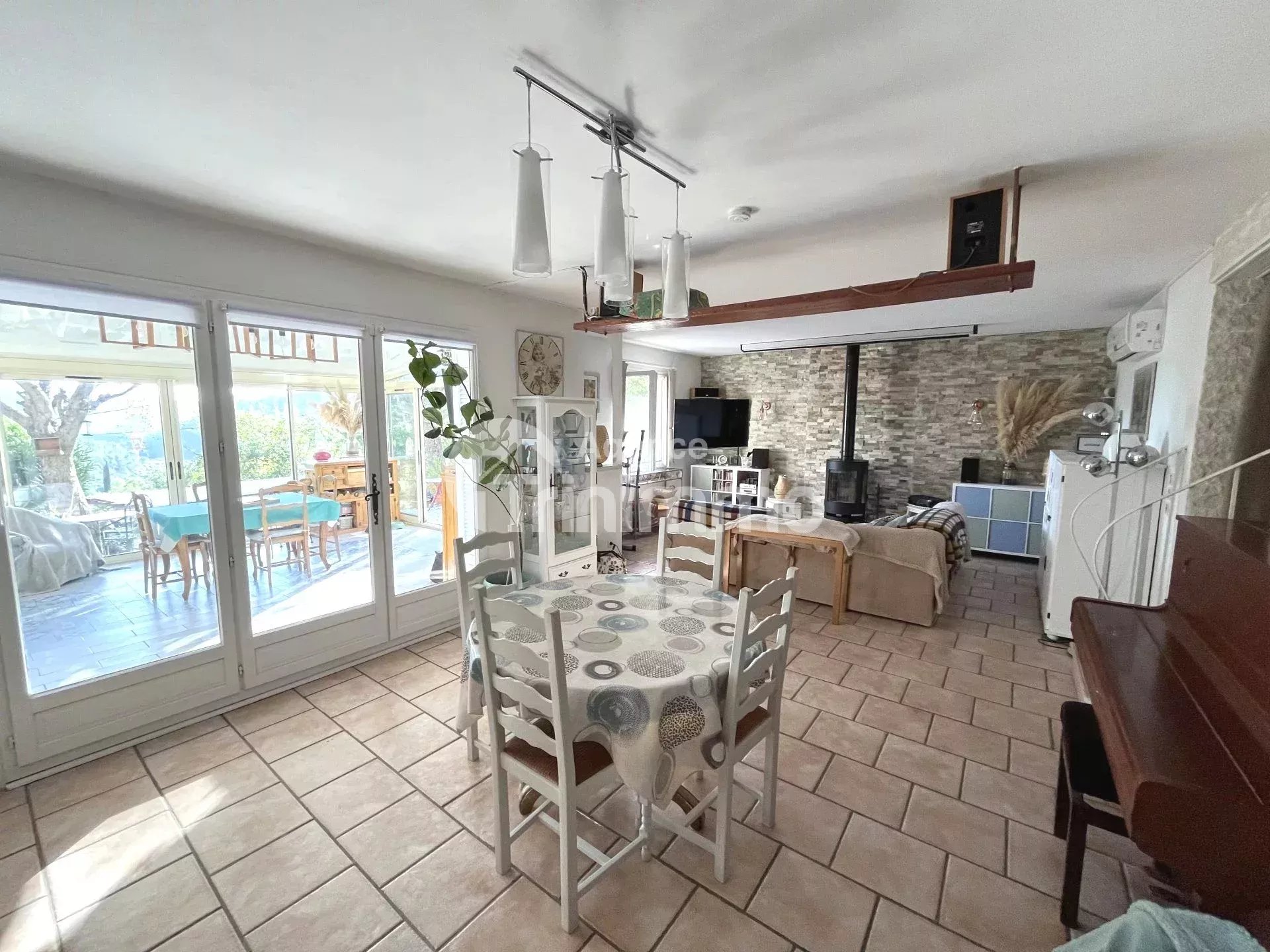 CANTARON! Maison 4-5 pièces d'environ 110m², mitoyenne par un côté, dans un environnement calme et ensoleillé avec vue dégagée, composée au rez-de-chaussée d'un grand salon d'environ 40m² avec poêle à bois, donnant sur une véranda de 22m², cuisine indépendante avec cellier, un wc. A l'étage: 3 chambres, un bureau avec mezzanine, terrasse, salle de bains avec wc. Terrasse, jardin, piscine hors-sol. Plusieurs places de parkings dans la propriété. Sur une parcelle de terrain d'environ 600m². Idéal famille !