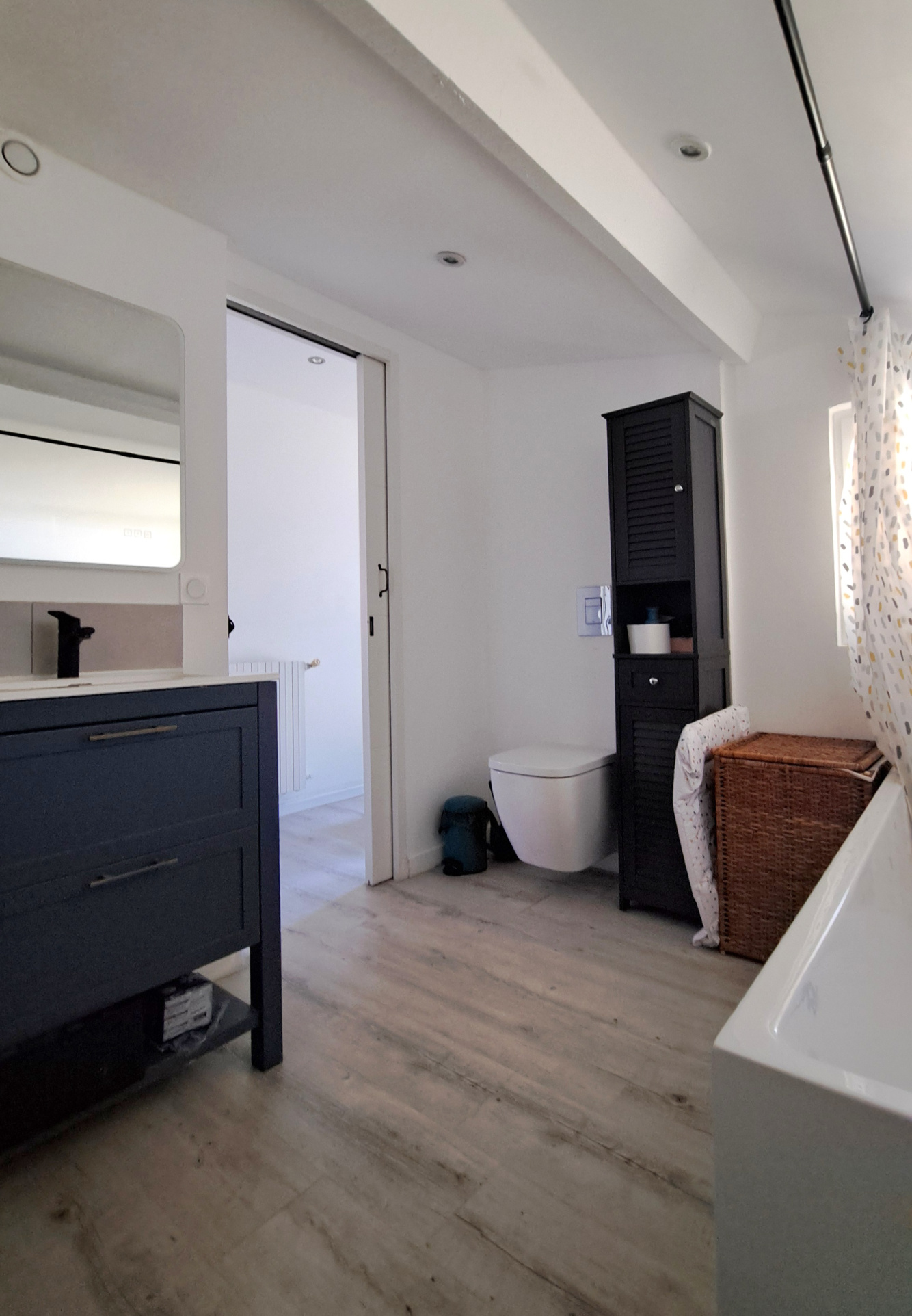 Charmante maison en pierre de Gironde et moellon possedant une surface de 103 m2, entièrement rénovée, qui se compose au rez-de-chaussée d'une entrée, d'un salon/séjour avec cuisine ouverte, d'un cellier/buanderie, d'une chambre, d'une salle de bains avec douche, baignoire et WC.