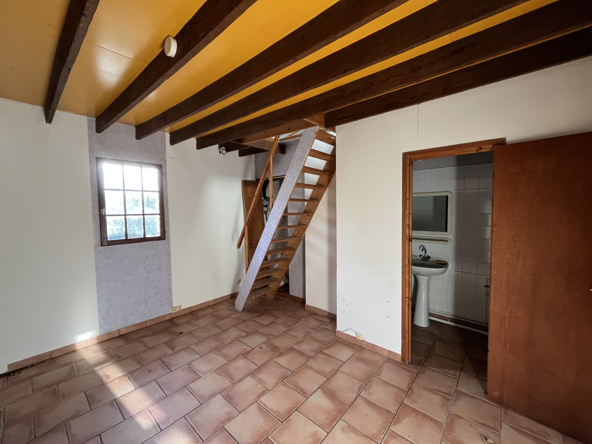elle se compose au rdc : cuisine, séjour, salle d'eau avec toilette, à l'étage : deux petite chambres, dont une avec un accés compliqué,