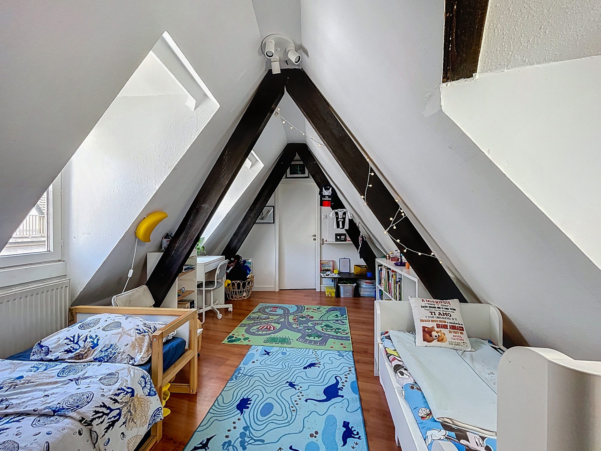 Ce bien saura vous séduire par sa configuration atypique, les poutres apparentes et son parquet massif et laissant une part belle à la pièce de vie.