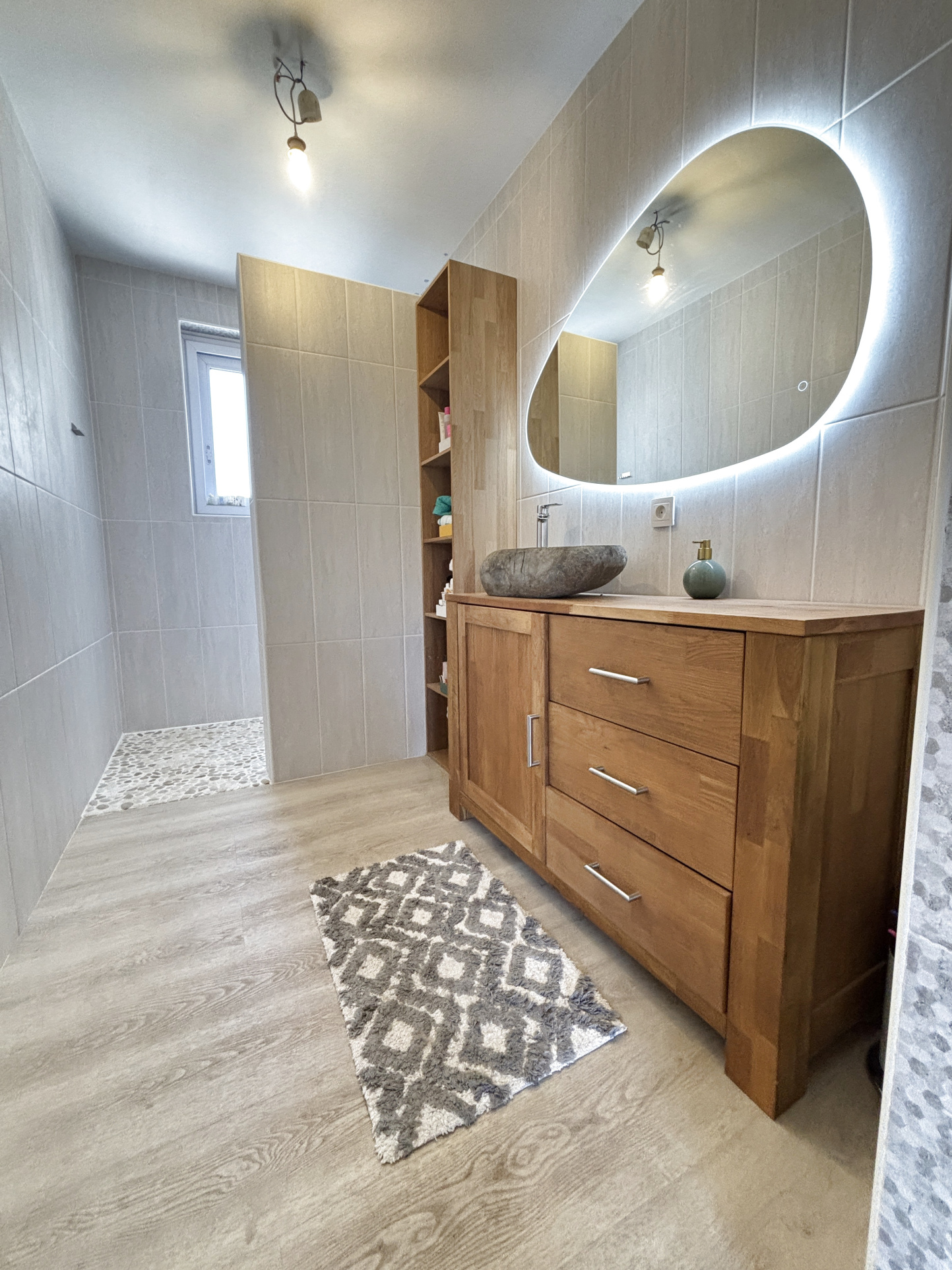 Composée au rez de chaussée d'un séjour lumineux avec cheminée et insert bois , salle à manger ,deux chambres dont une avec un dressing, une salle d'eau et un WC séparé.