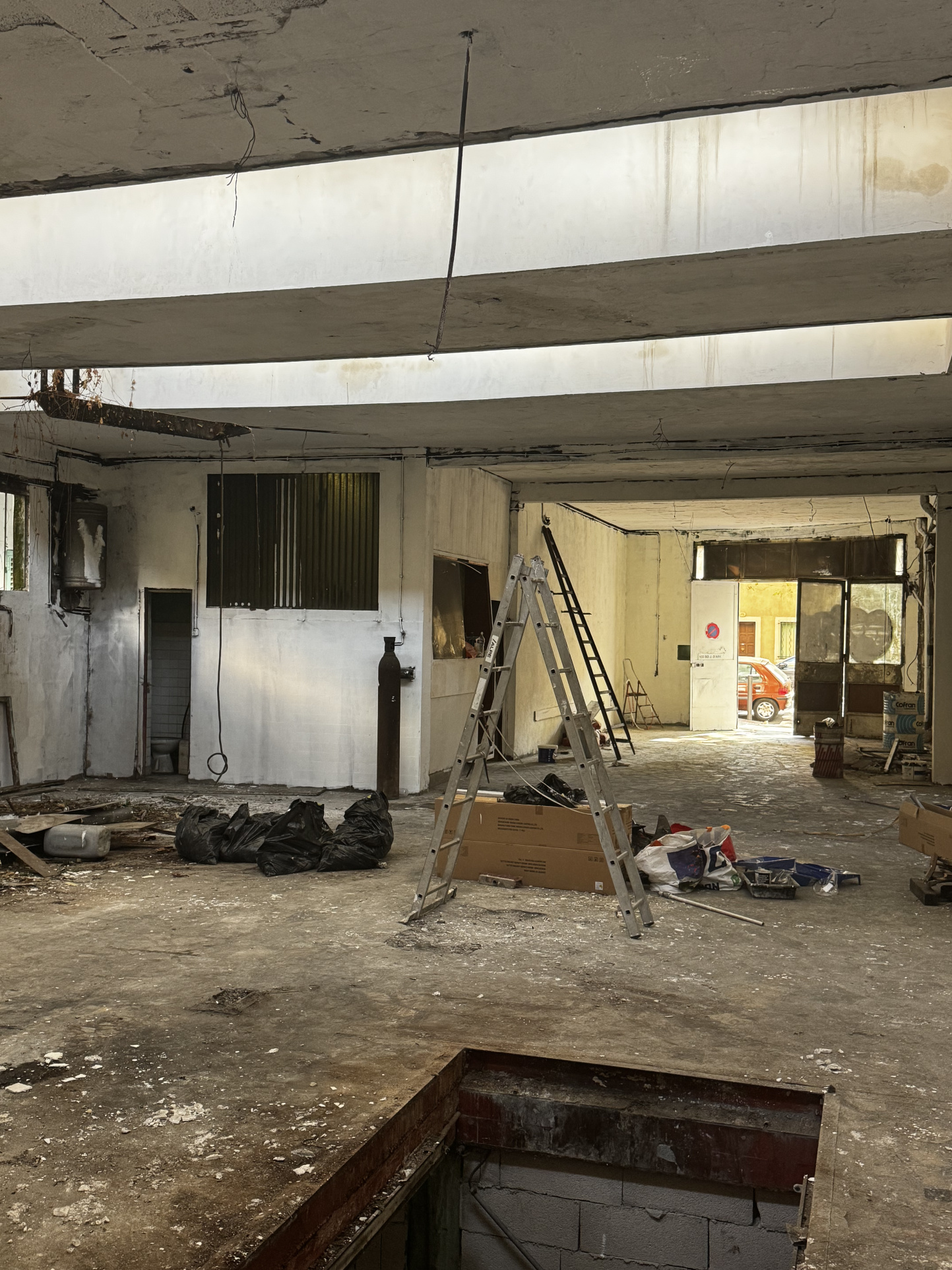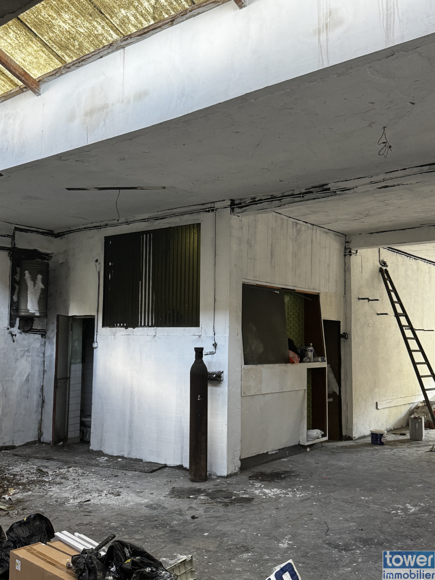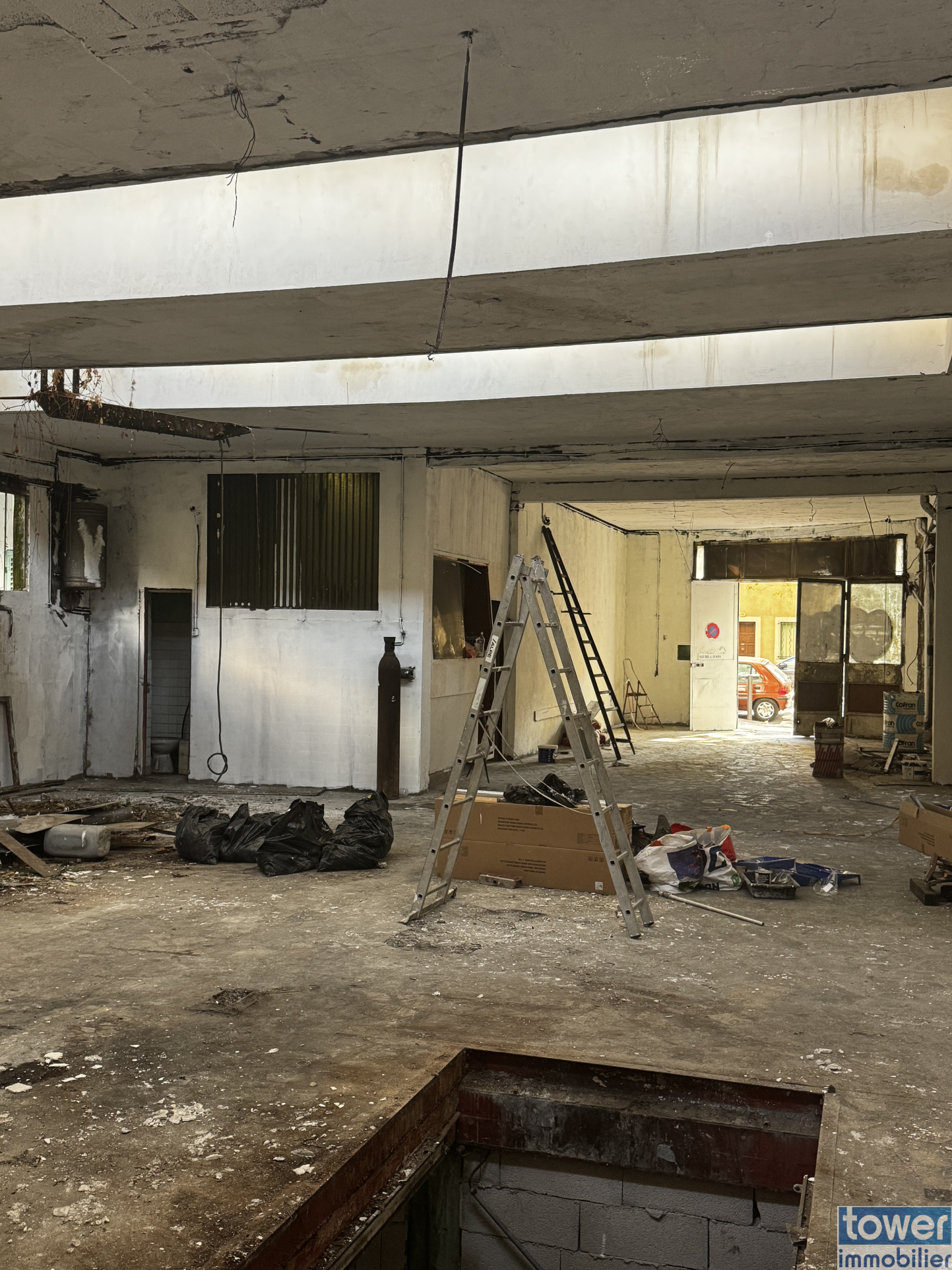 Un grand espace principal d'environ 187 m2, anciennement exploité comme garage, avec belle hauteur sous plafond et large accès.
