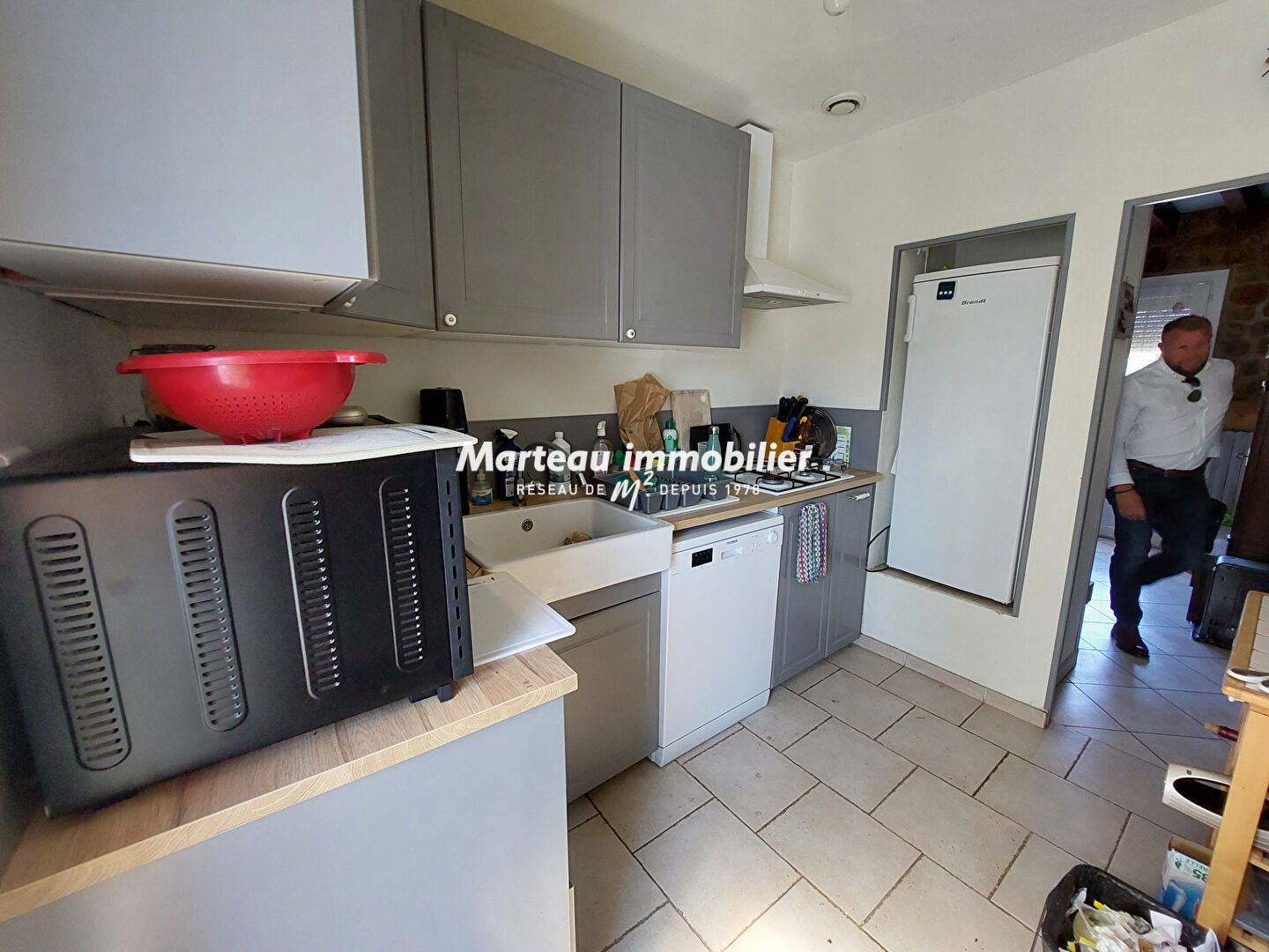 Elle offre une belle pièce de vie lumineuse avec poutres apparentes, cuisine équipée, deux chambres, bureau, salle d'eau et WC.
