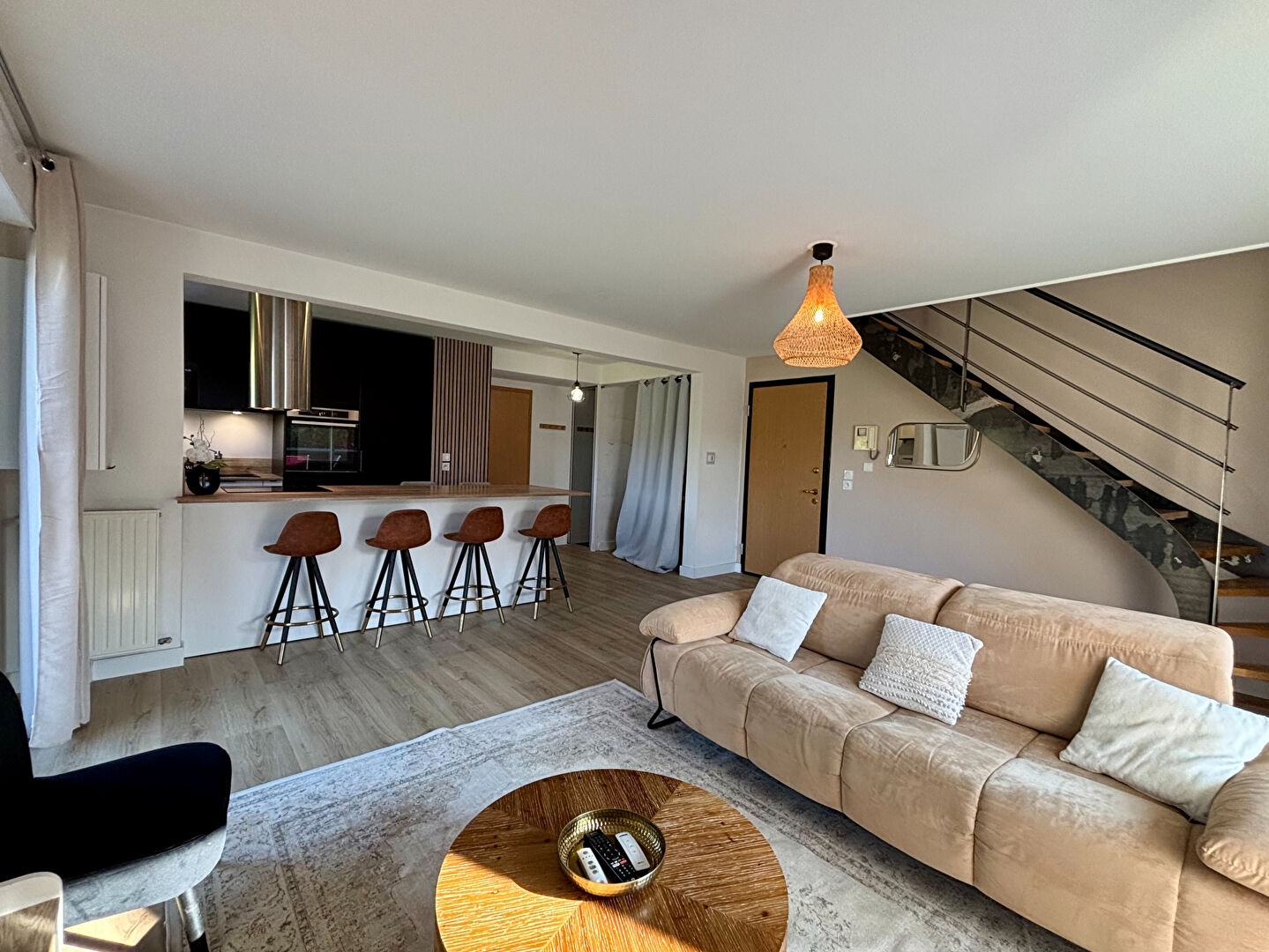 Cette pièce de vie cozy et moderne de 37m2 donne accès à la terrasse et au balcon. Un dégagement dessert un wc séparé, une chambre avec rangements et une salle de bain.