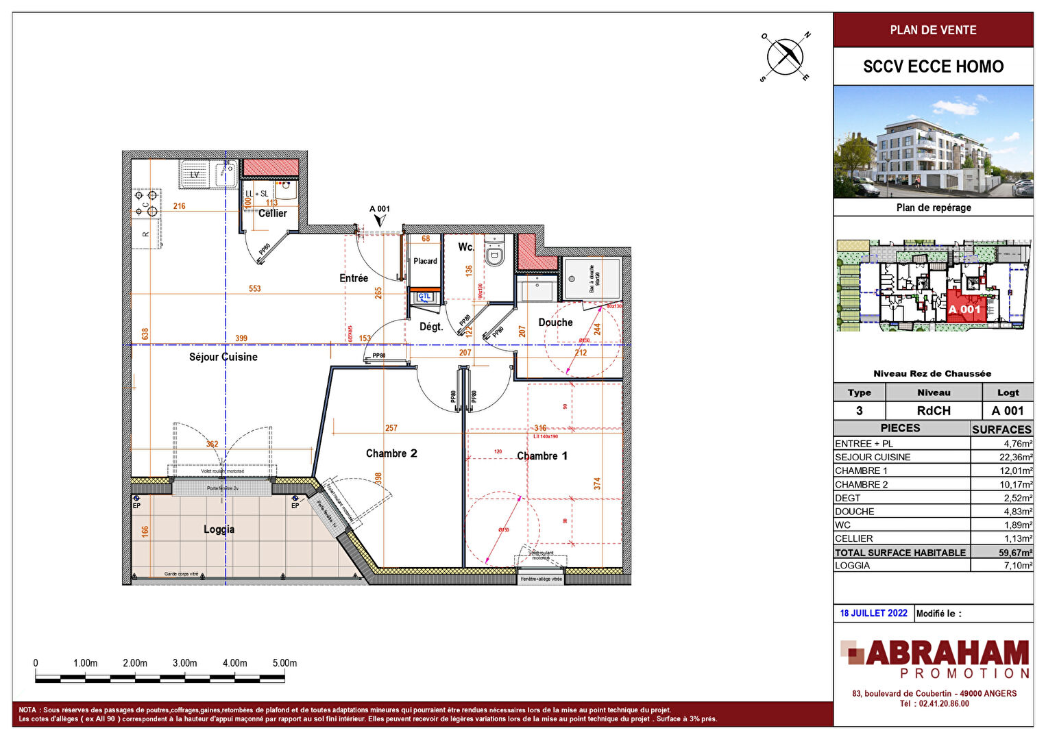 C'est un appartement de type T3 (F3 / 3 pièces / 2 chambres), d'une surface habitable totale de 59.67 m², situé au rez-de-chaussée, exposé Sud-Est et destiné aux différents projets : investissement locatif, résidence principale et résidence secondaire. Cet appartement est éligible aux dispositifs Droit Commun et Sans dispositif pour habiter ou investir à Angers.