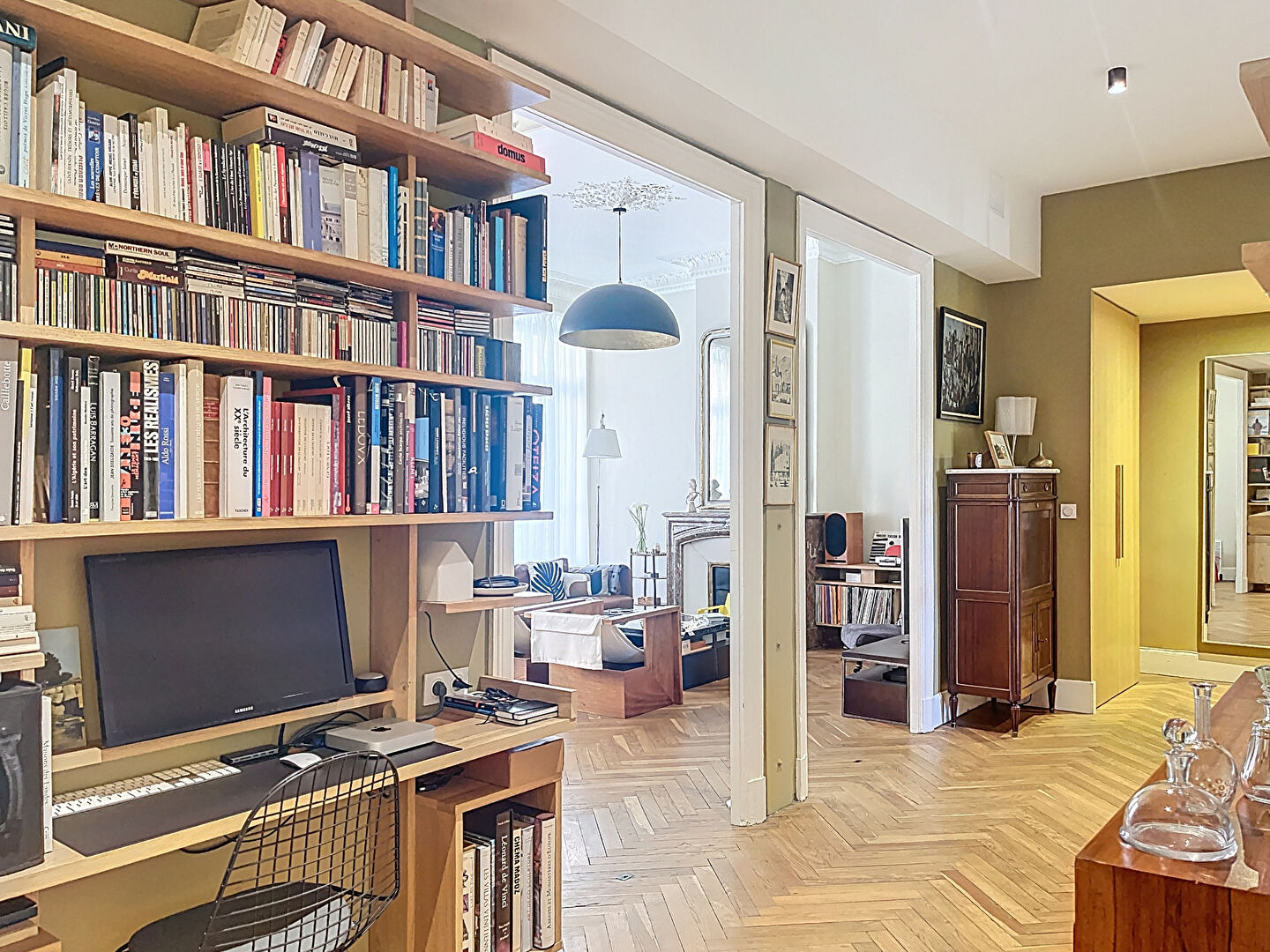 Une entrée avec rangements s'ouvre sur un couloir bibliothèque-bureau, menant à un double séjour avec parquet, moulures et cheminées décoratives, ainsi qu'à une cuisine contemporaine entièrement équipée.
