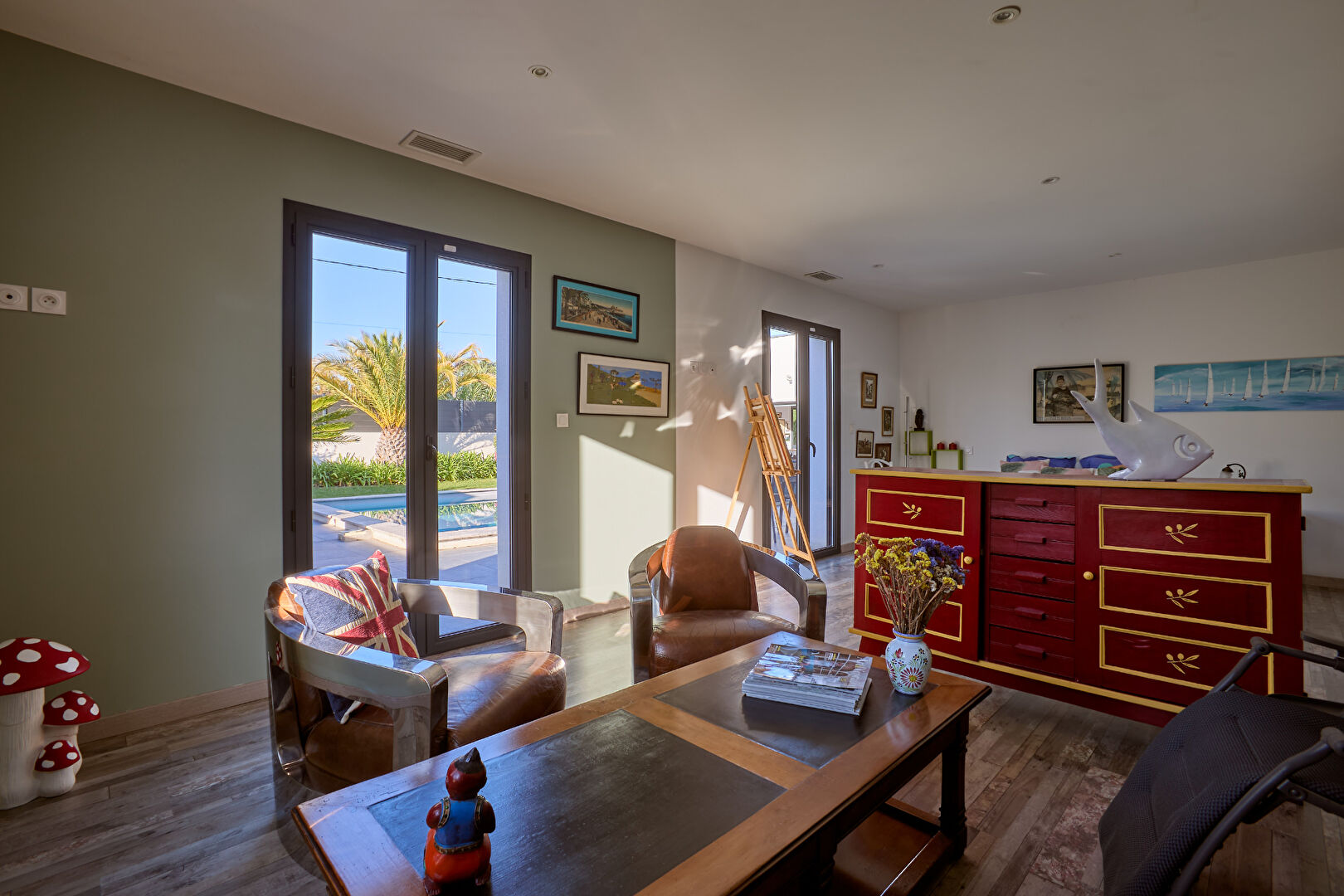 Une pièce de vie spacieuse de plus de 50 m², comprenant un salon, une salle à manger et une cuisine ouverte entièrement aménagée et équipée, tournée vers la terrasse et la piscine.